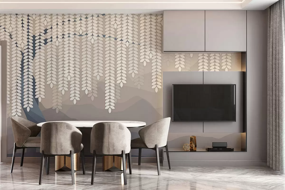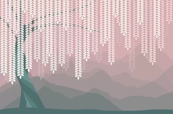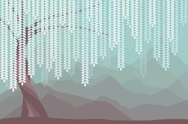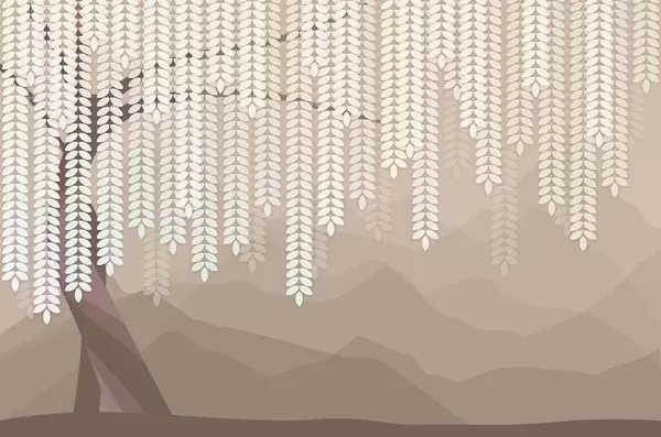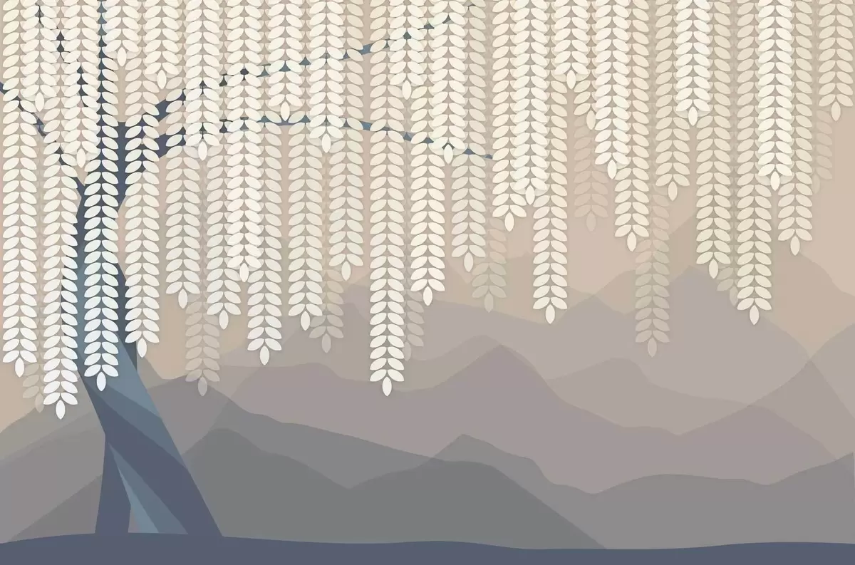 Тапете за зид стилизована врба са висећим лишћем на позадини минималистичких планина у нијансама беж и плаво-зелене бр. w05232