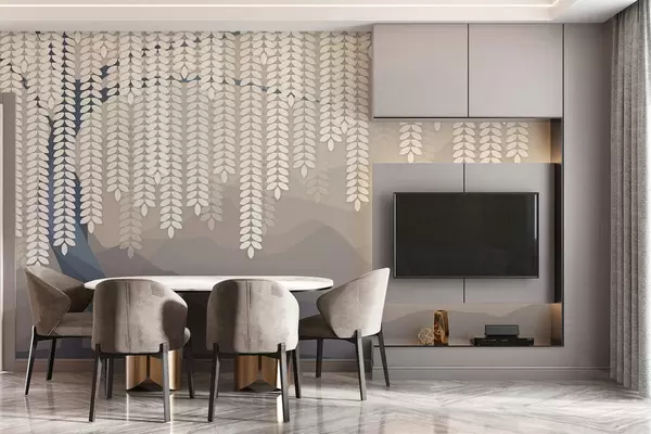 Тапете за зид стилизована врба са висећим лишћем на позадини минималистичких планина у нијансама беж и плаво-зелене бр. w05232