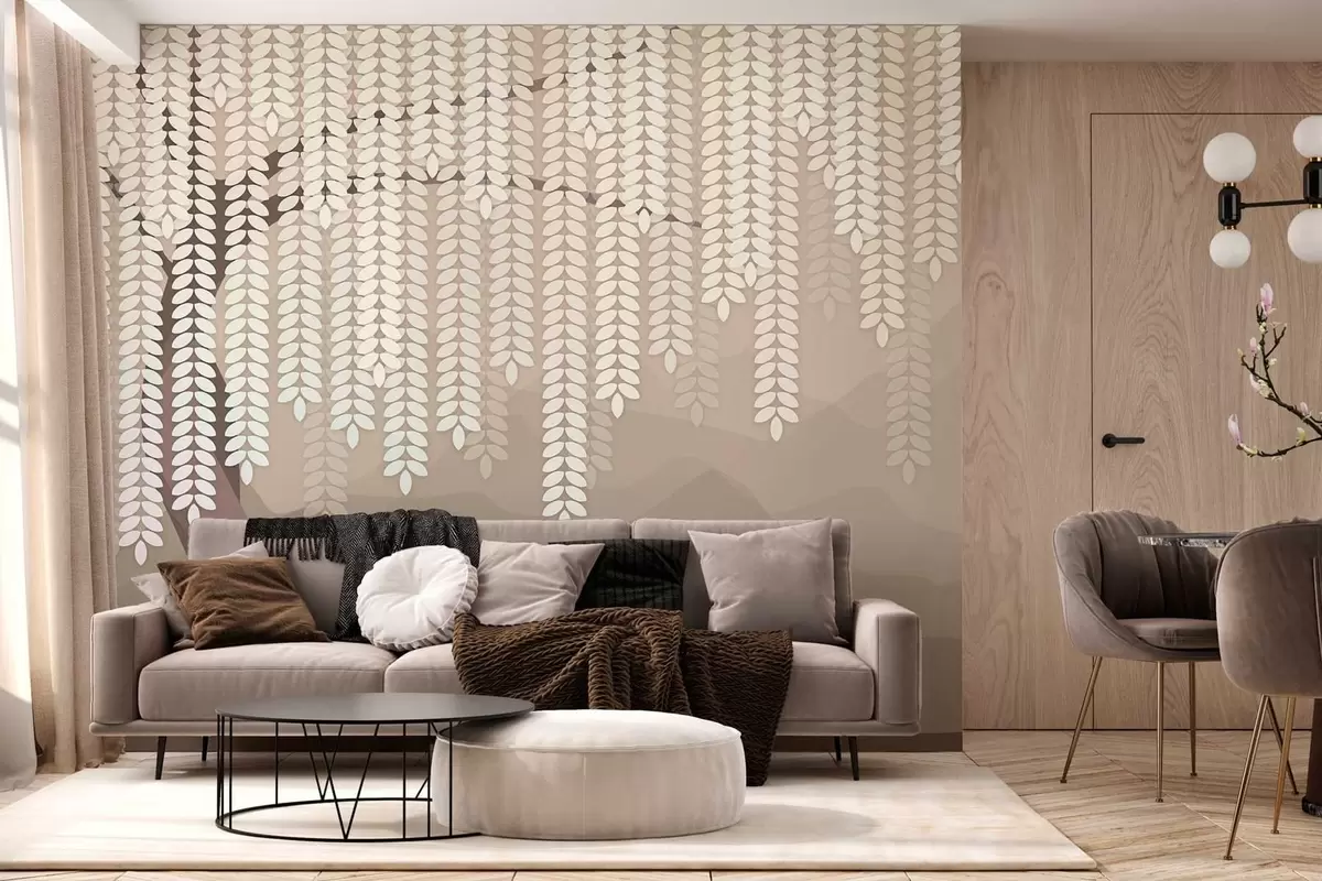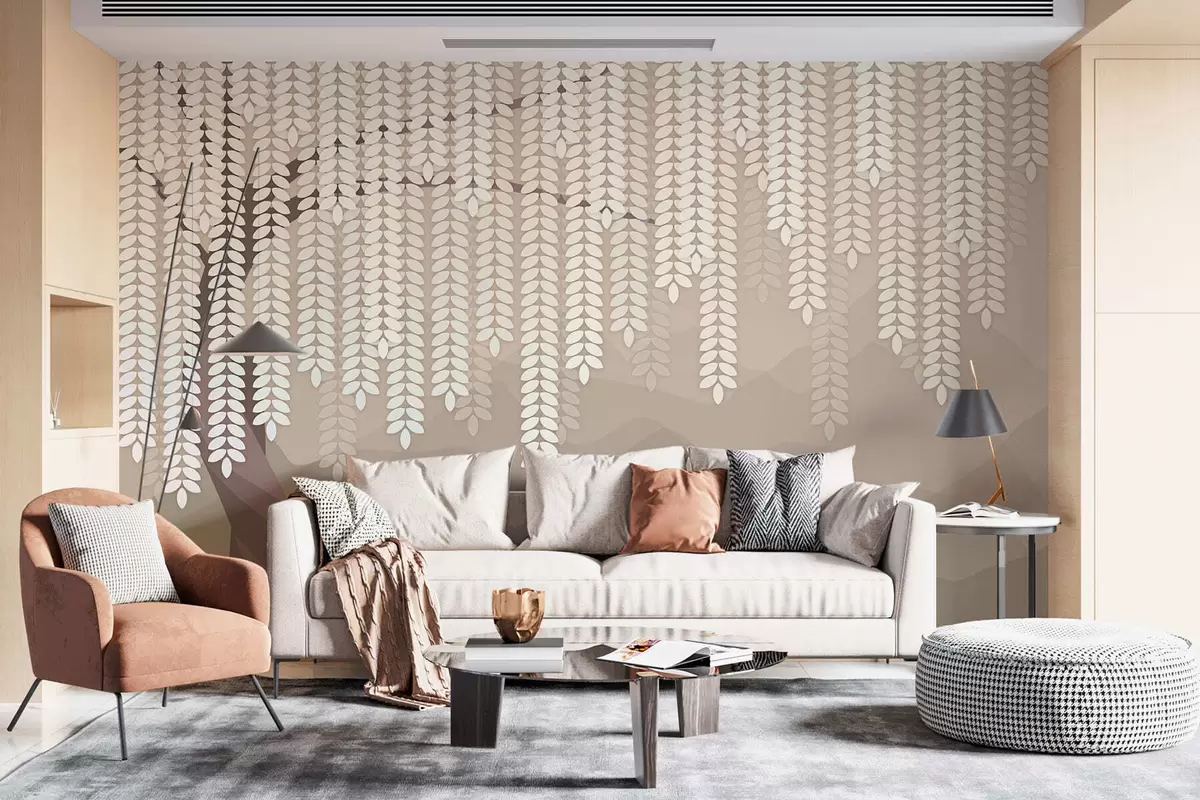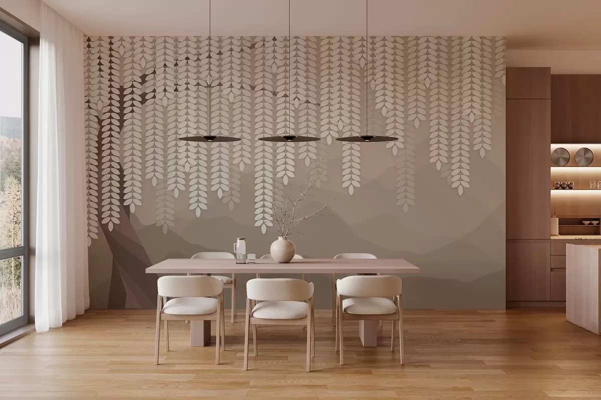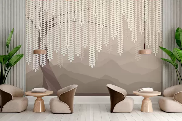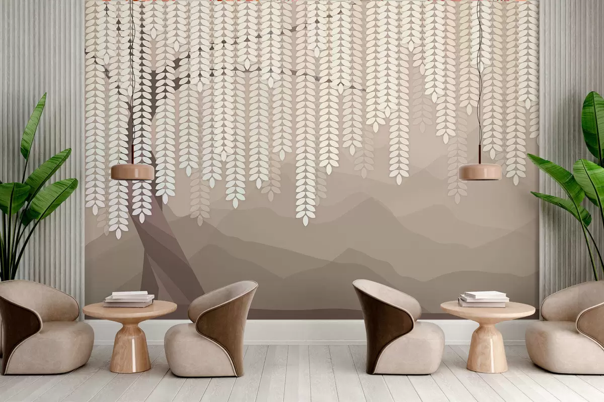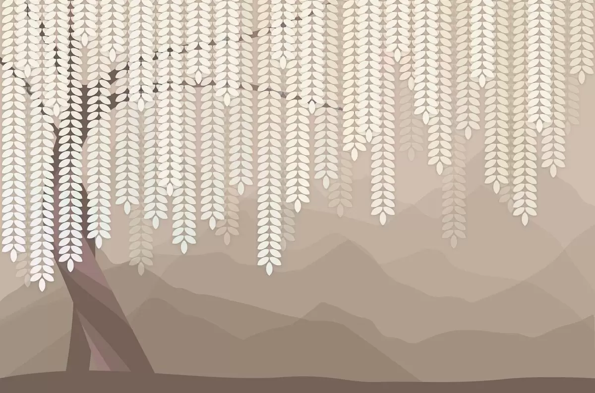 Тапете за зид стилизована врба са висећим лишћем на позадини минималистичких планина у нијансама кафе бр. w05232v2
