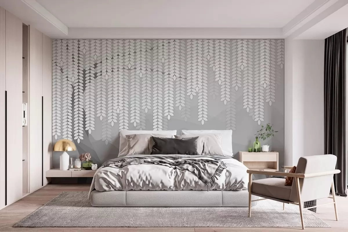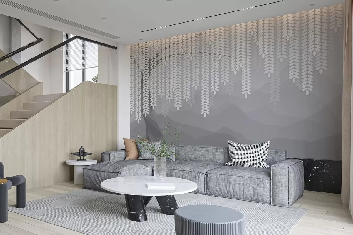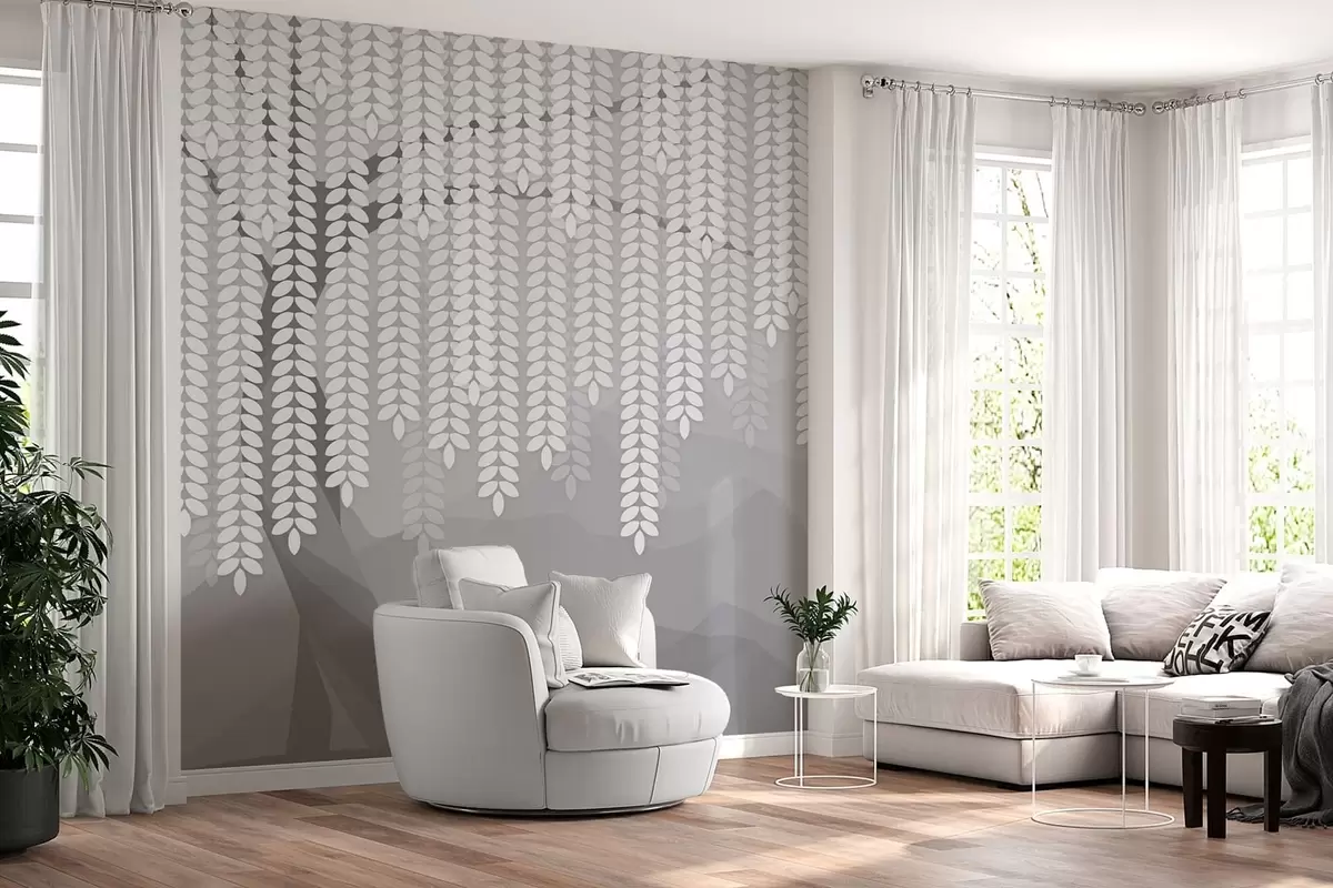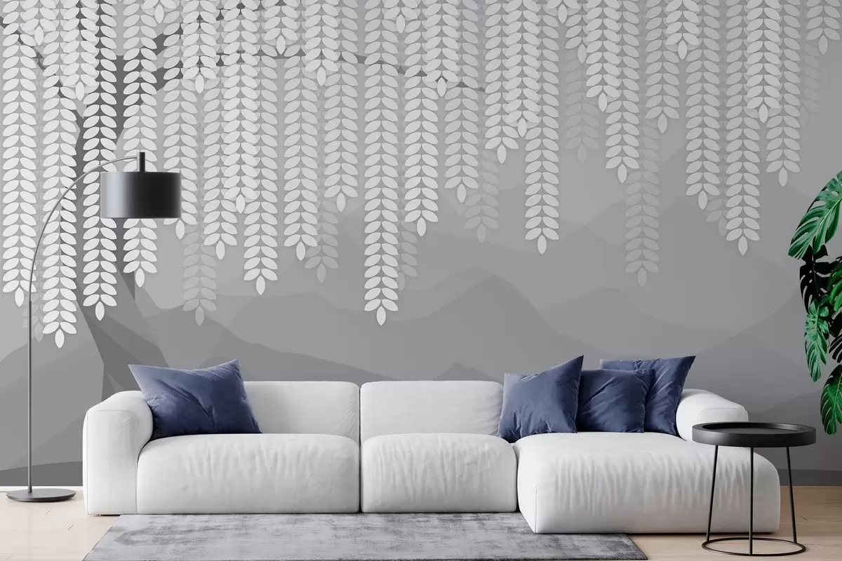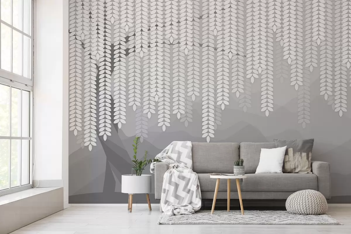Тапете за зид стилизована врба са висећим лишћем на позадини минималистичких планина у нијансама сиве бр. w05232v3
