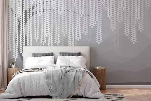 Тапете за зид стилизована врба са висећим лишћем на позадини минималистичких планина у нијансама сиве бр. w05232v3