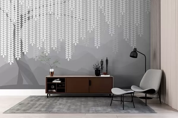 Тапете за зид стилизована врба са висећим лишћем на позадини минималистичких планина у нијансама сиве бр. w05232v3