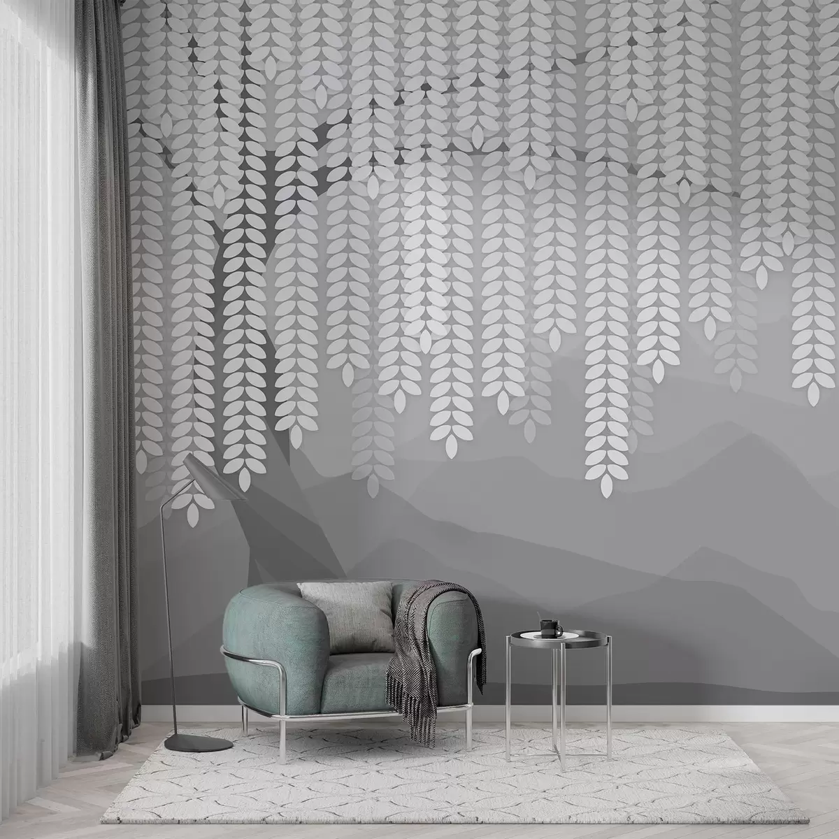 Тапете за зид стилизована врба са висећим лишћем на позадини минималистичких планина у нијансама сиве бр. w05232v3