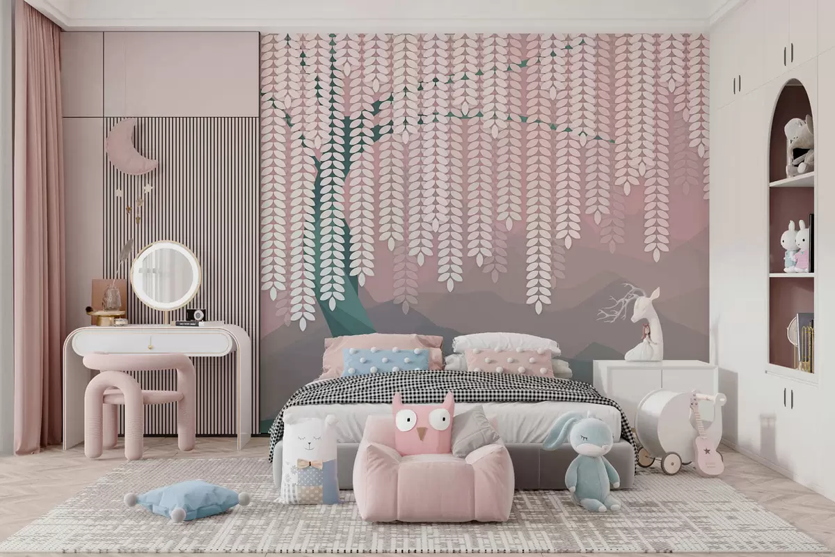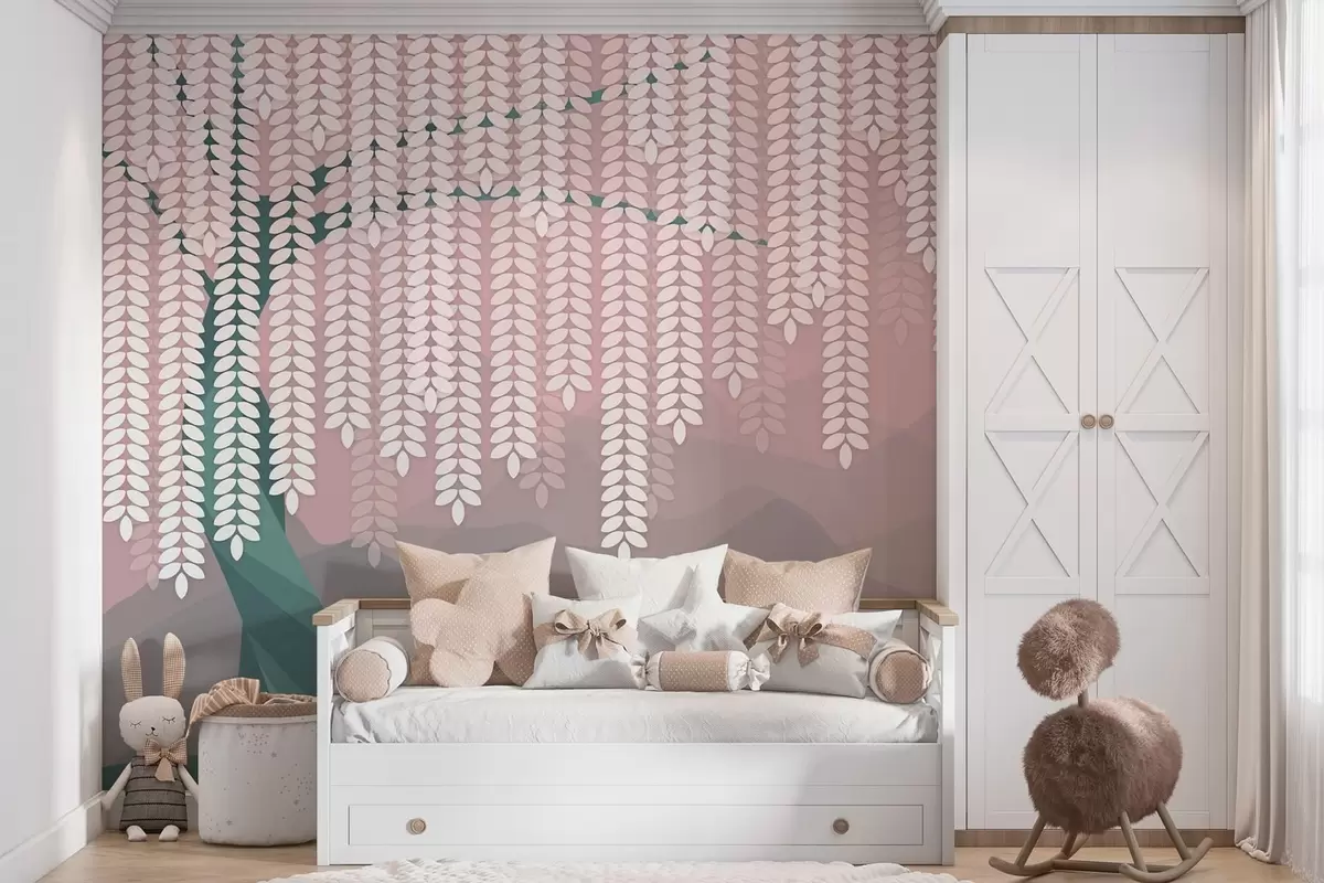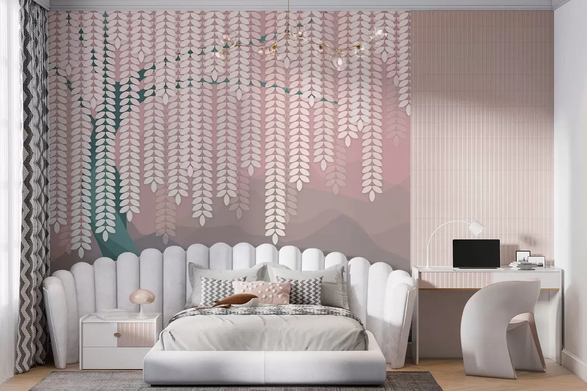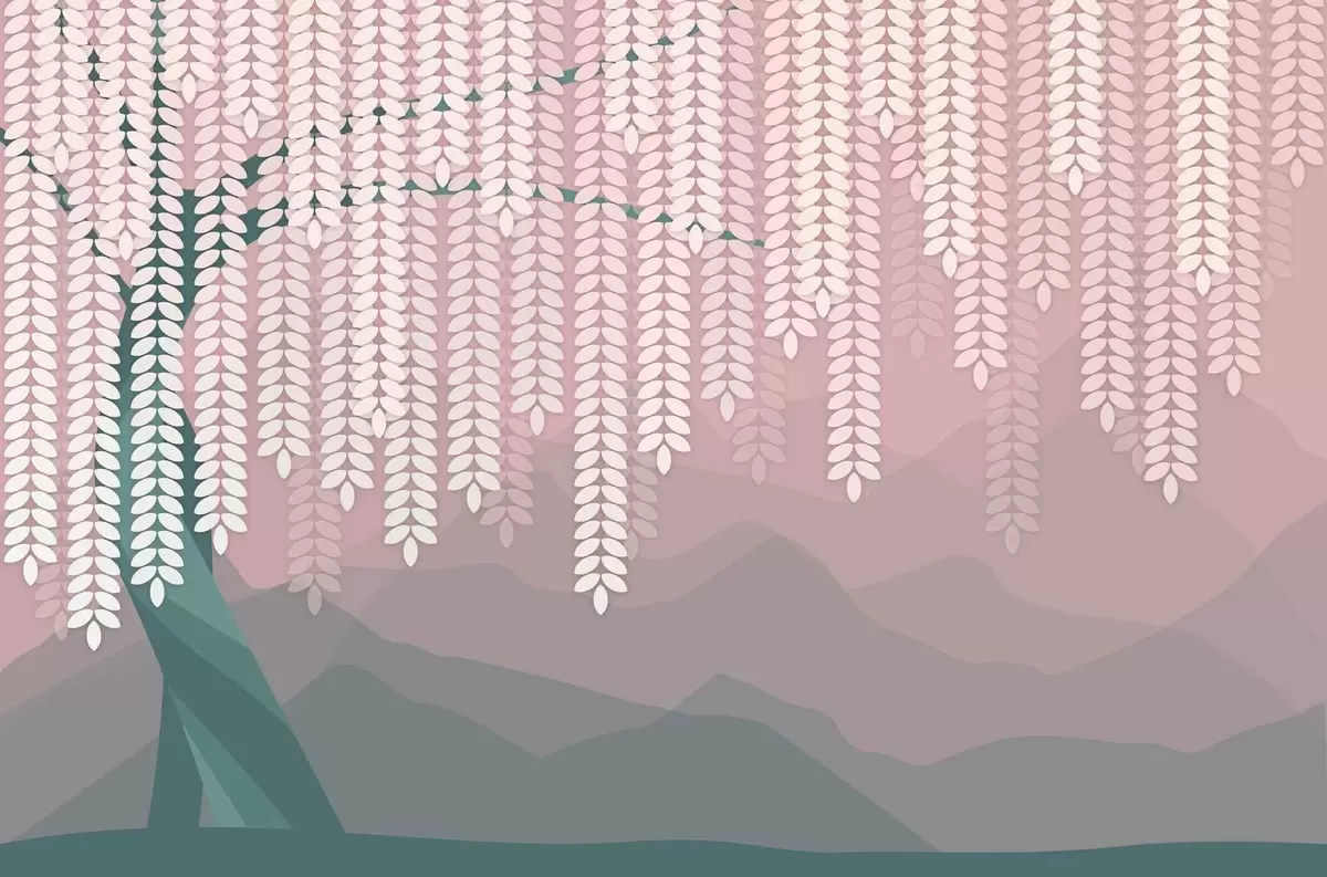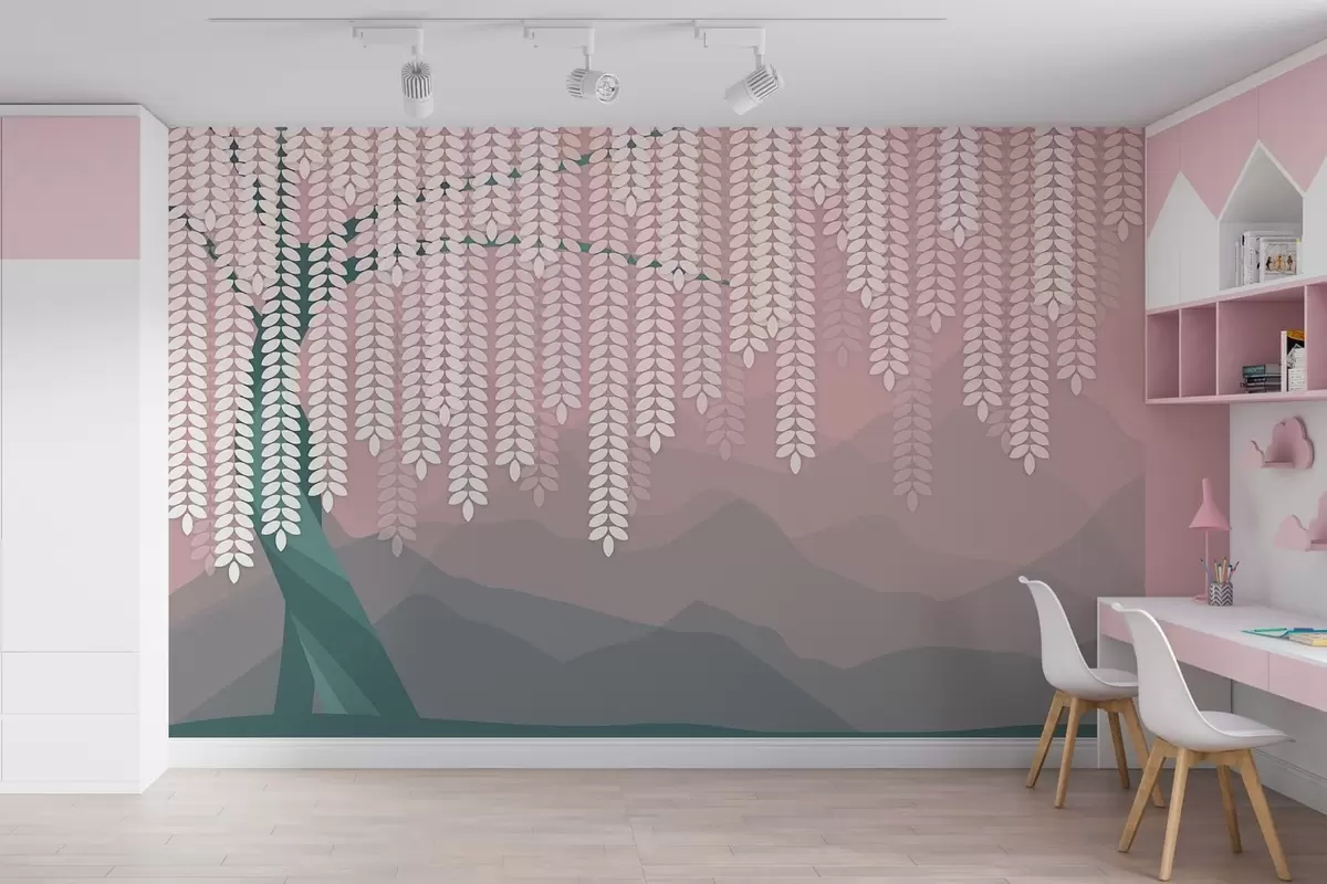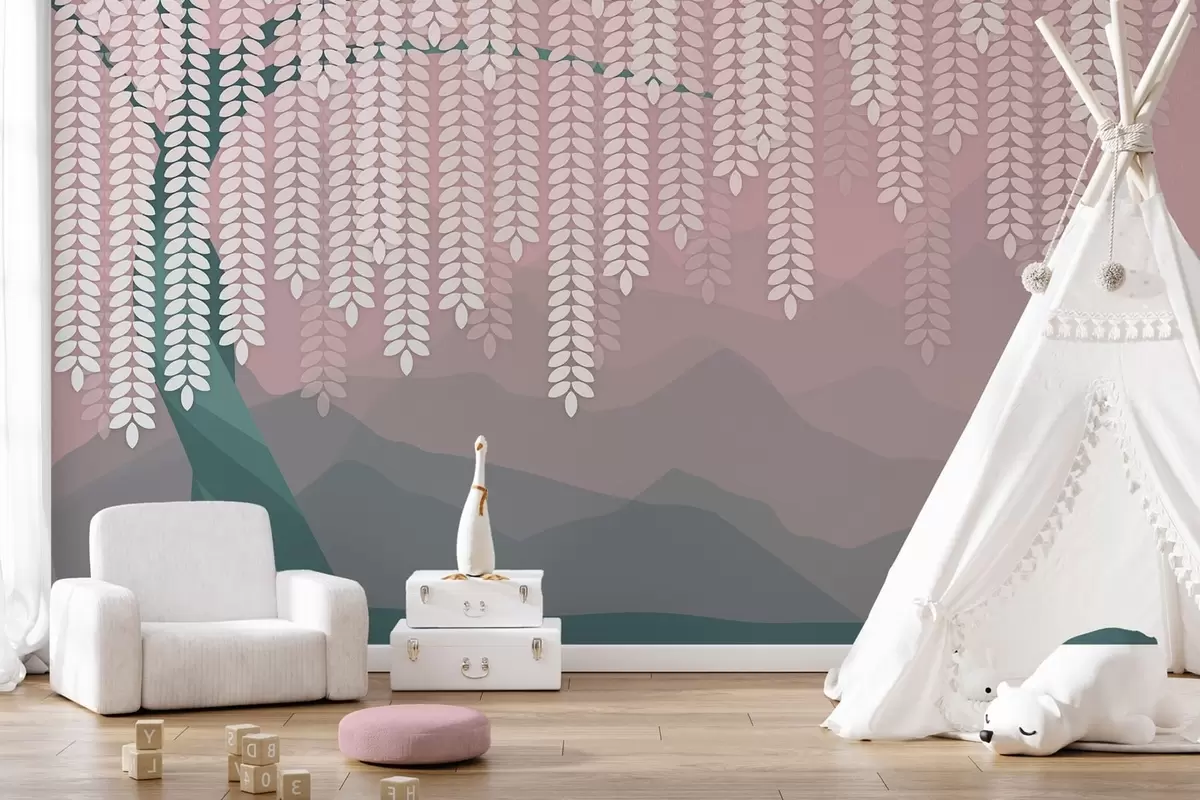 Тапете за зид стилизована врба са висећим листовима на позадини минималистичких планина у нијансама ружичасте и тамнозелене бр. w05232v4