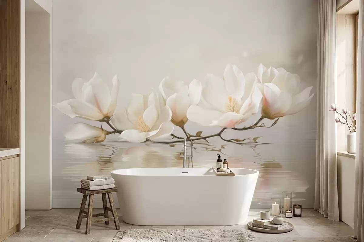 Тапете за зид Светли цветови магнолије на грани изнад одраза у води бр. w05353