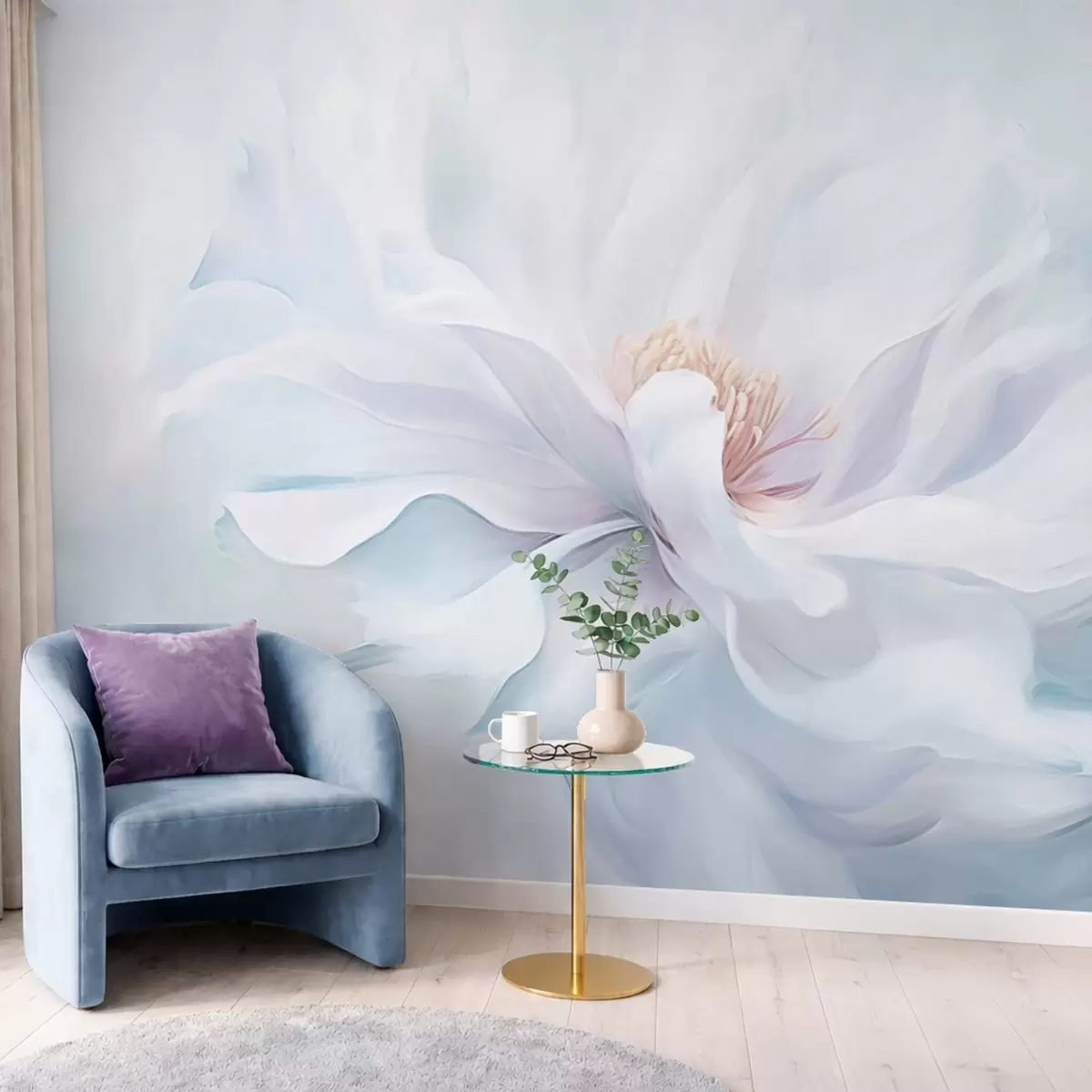 Тапете за зид Нежни бели цвет са лепршавим латицама на плавој позадини бр. w05354