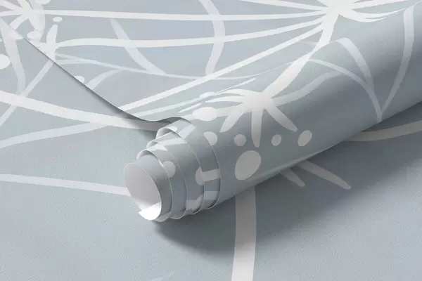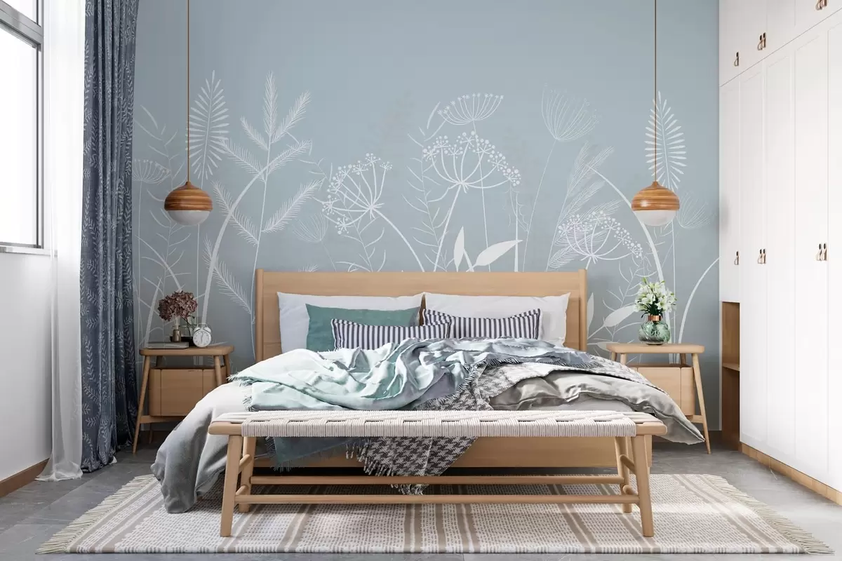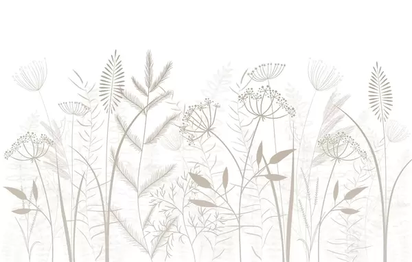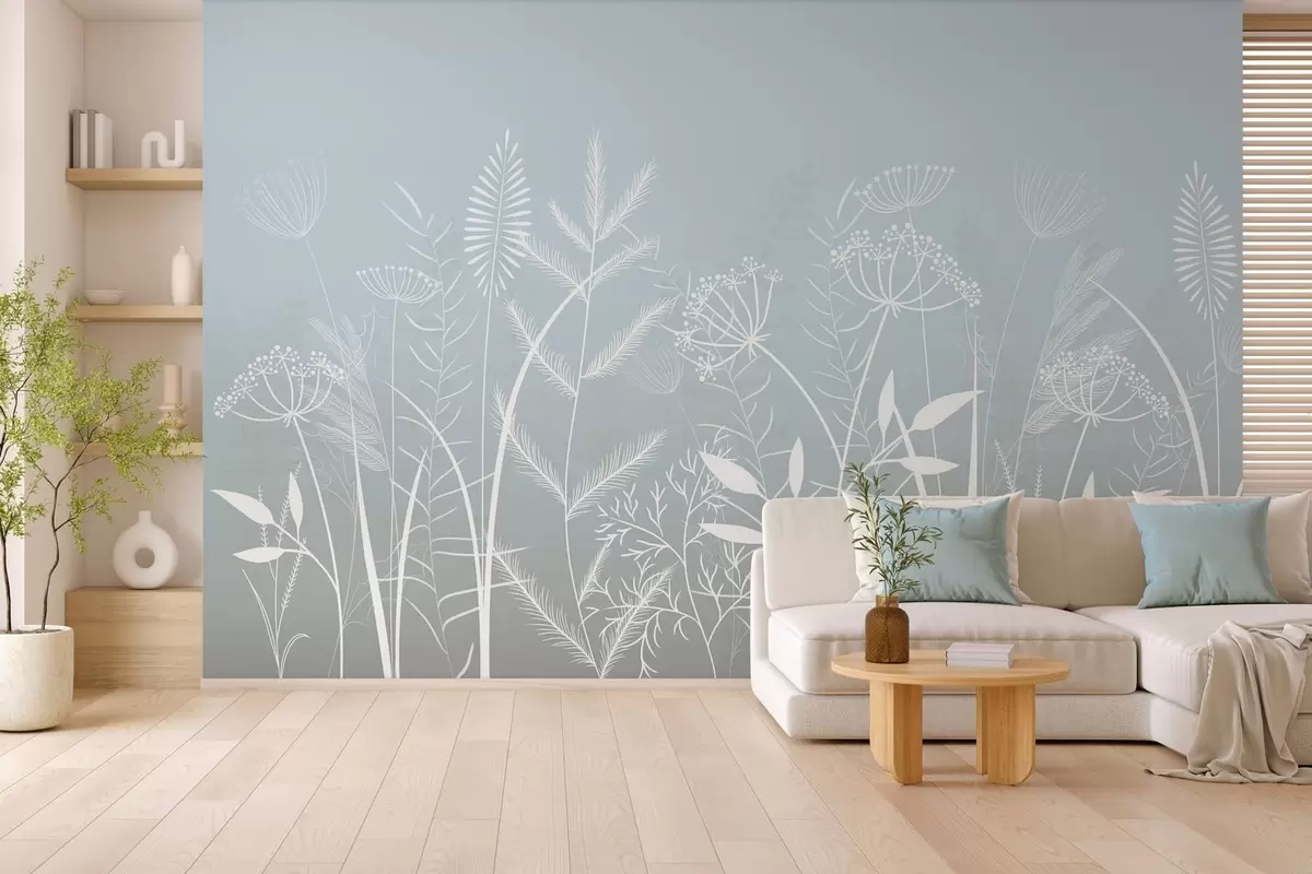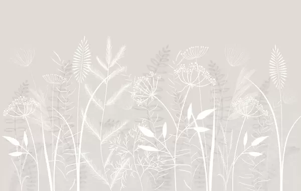 Тапете за зид нежне ручно осликане дивље траве и цвеће на сиво-плавој позадини бр. w05383