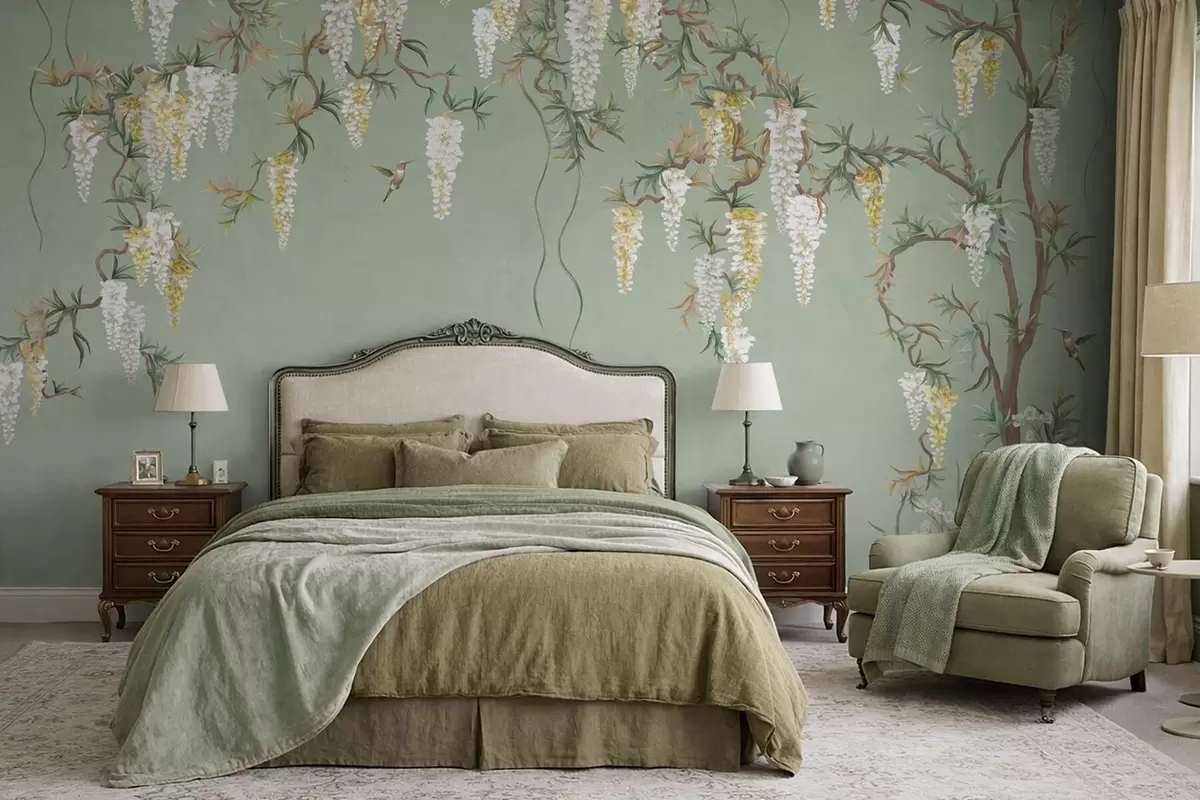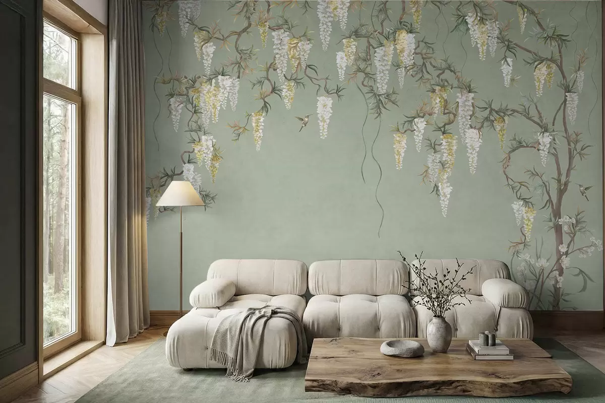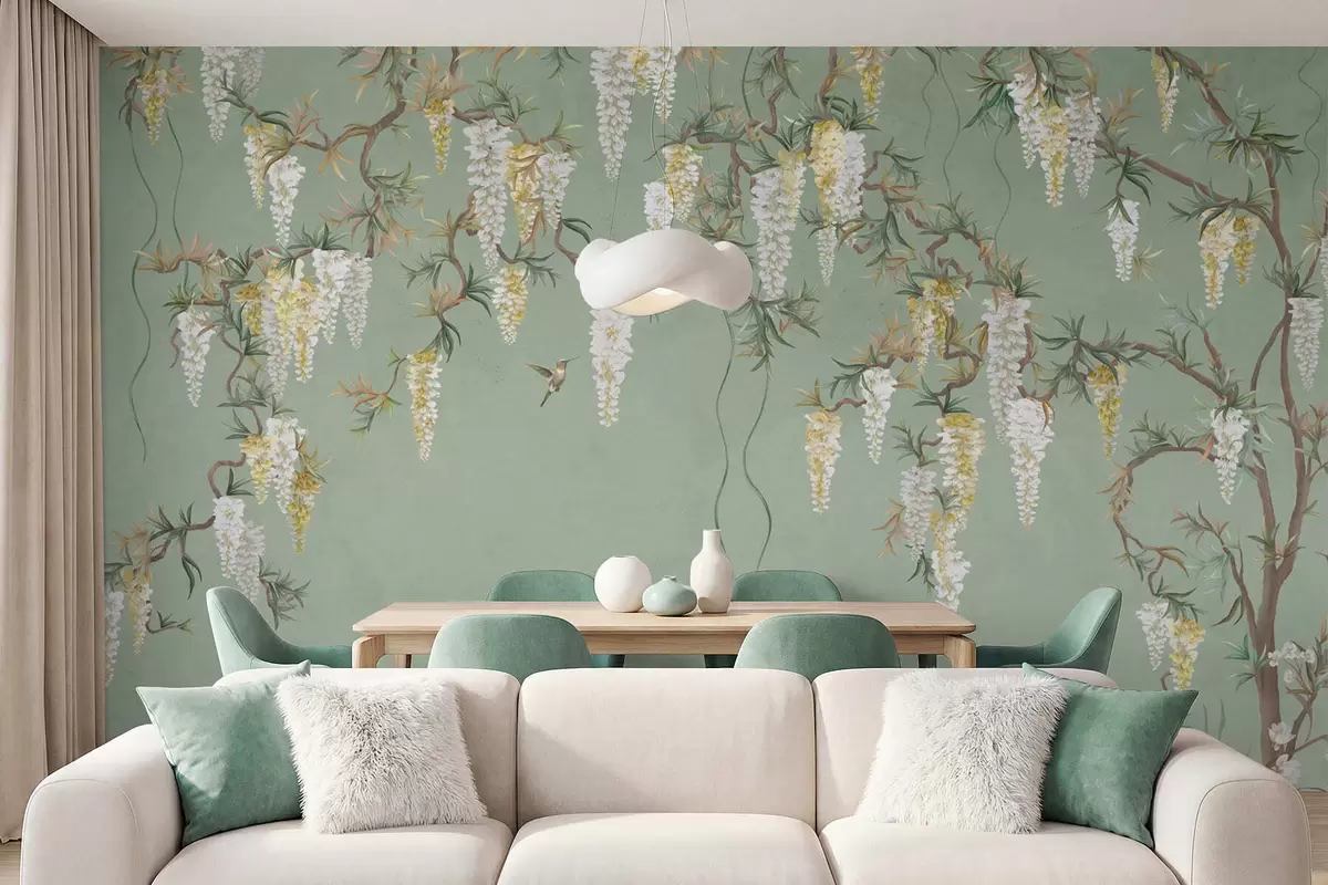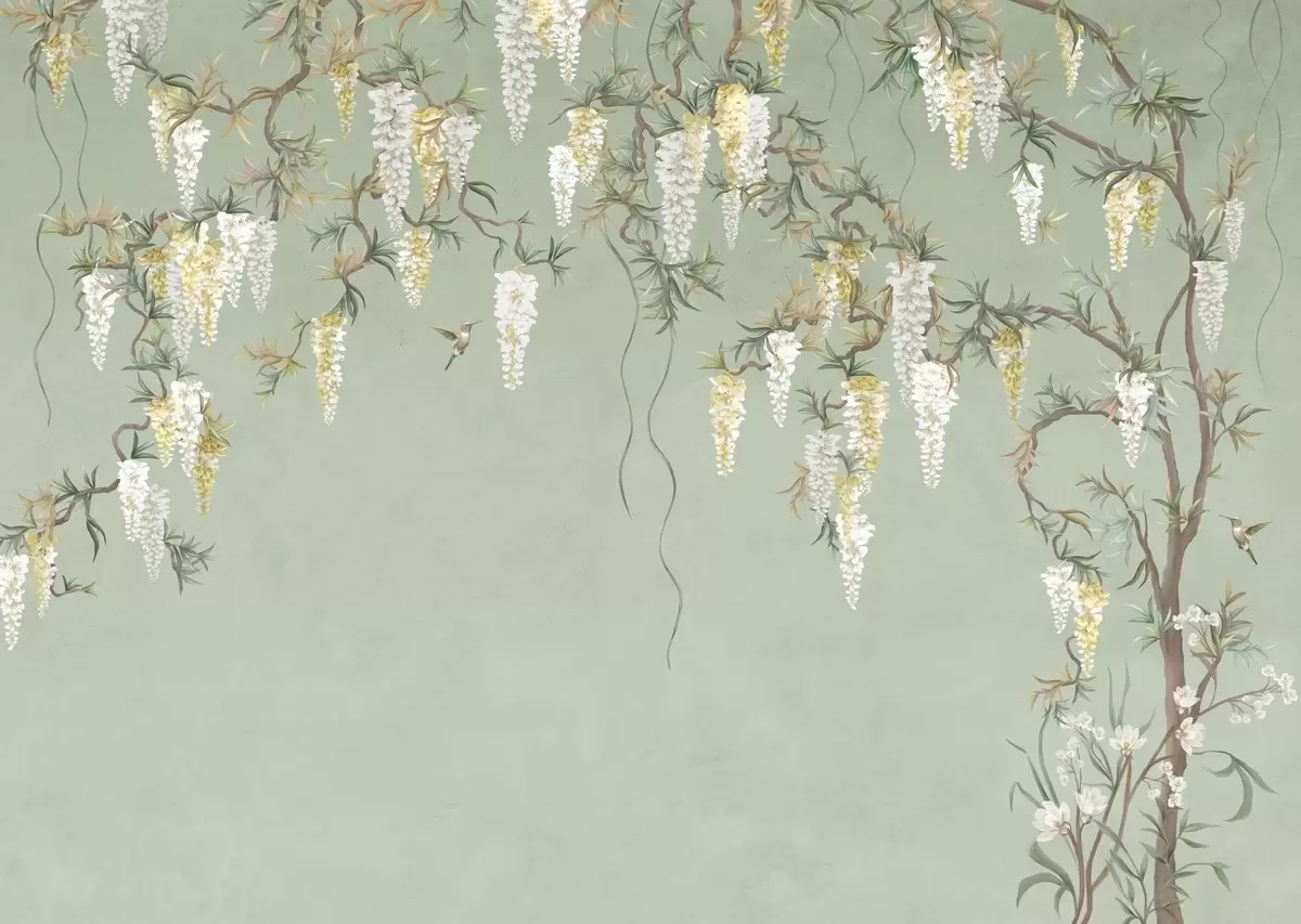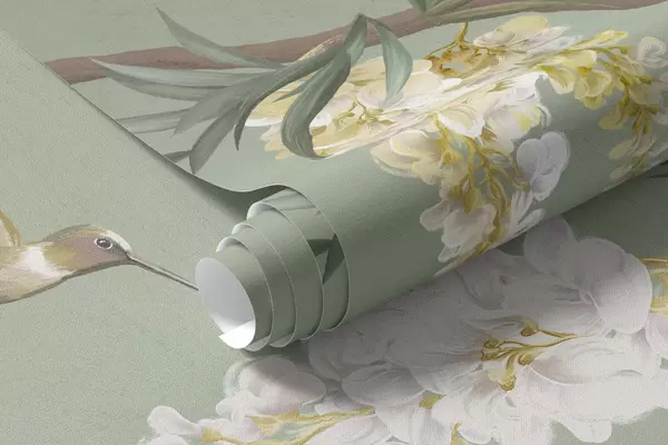 Тапете за зид Цветне гране са белим цветовима и птицама на зеленој површини бр. w05394