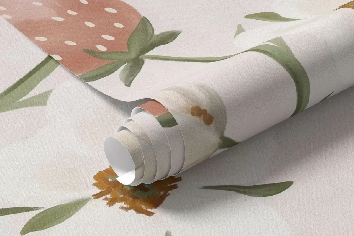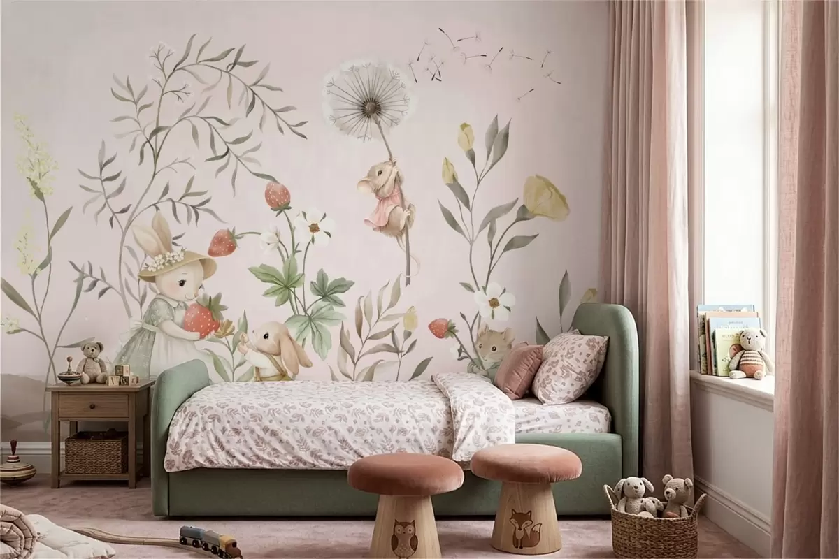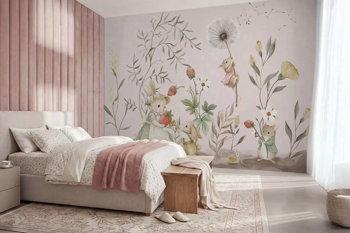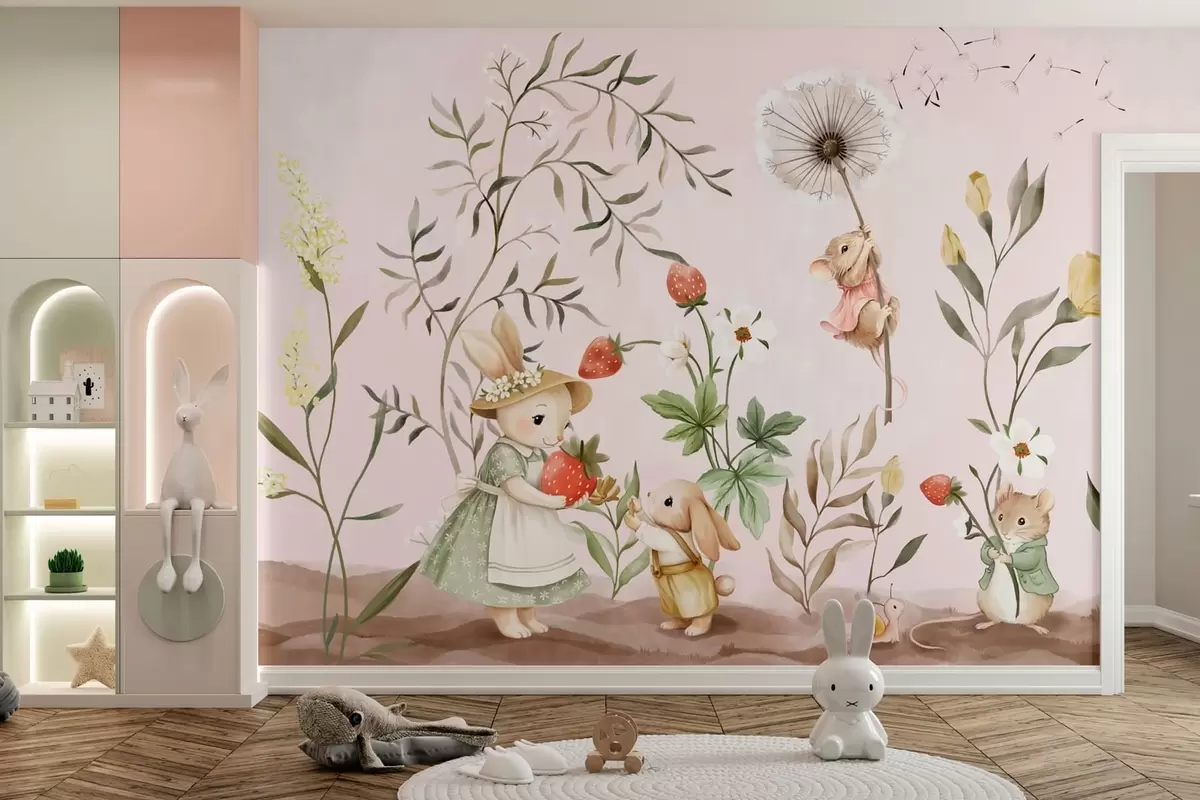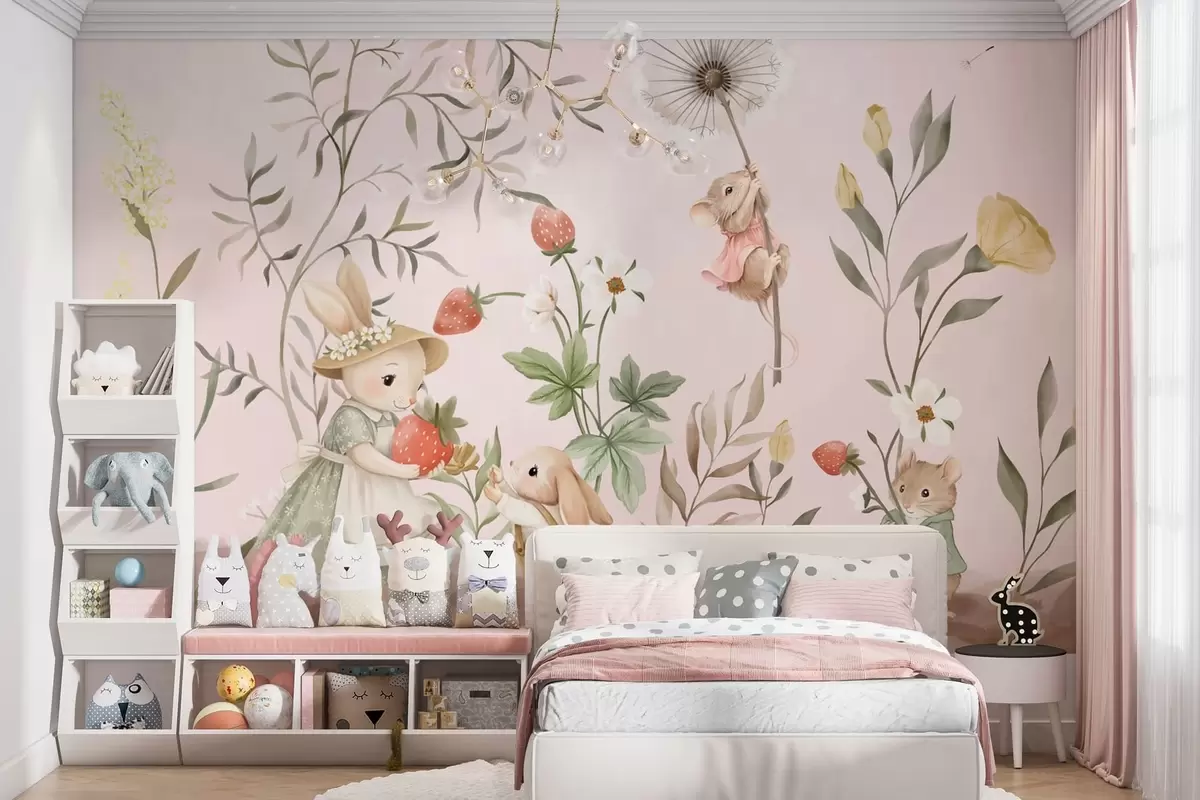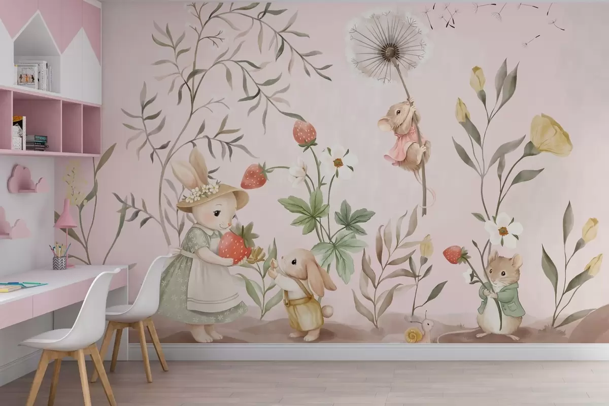 Тапете за зид Илустрација животиња са јагодама на нежно ружичастој позадини бр. w05422v1