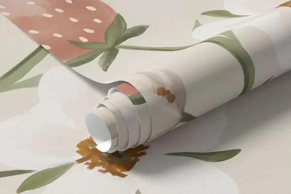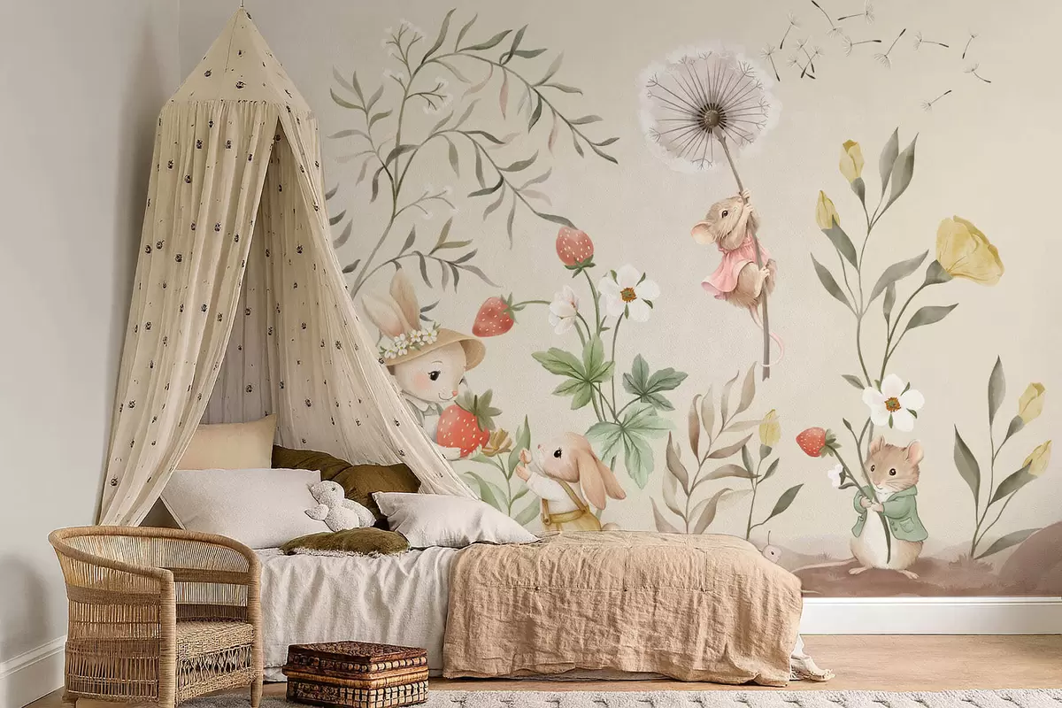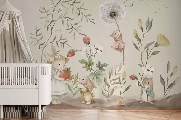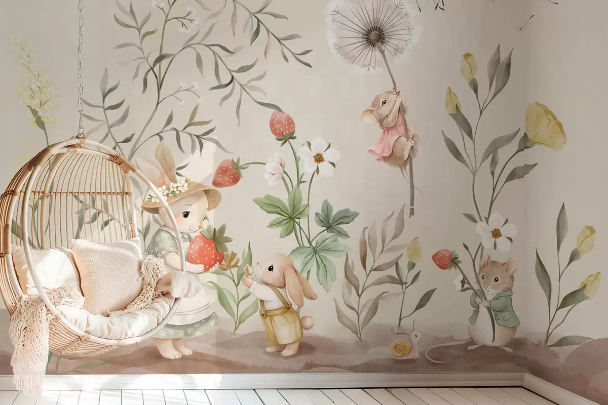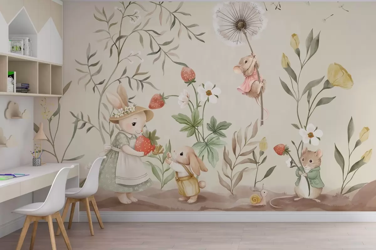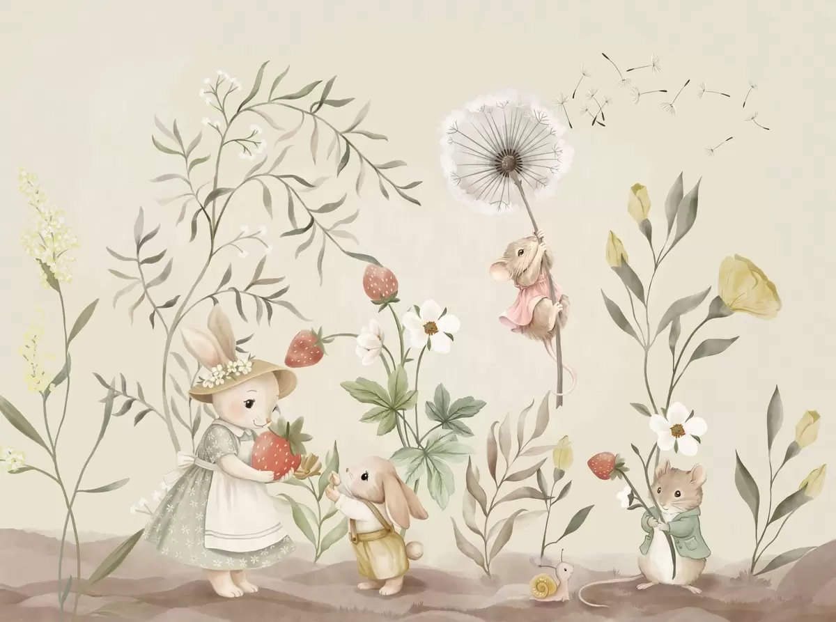 Тапете за зид Илустрација зеца, миша и биљака са јагодама бр. w05422v2