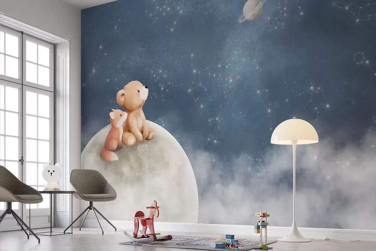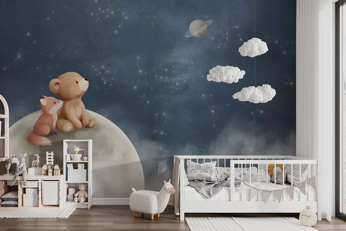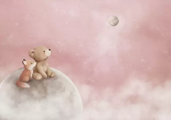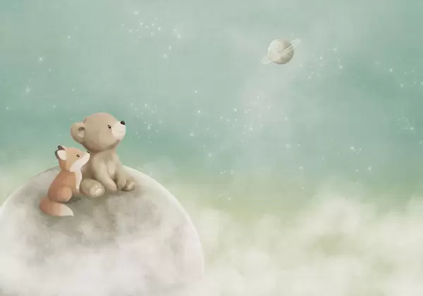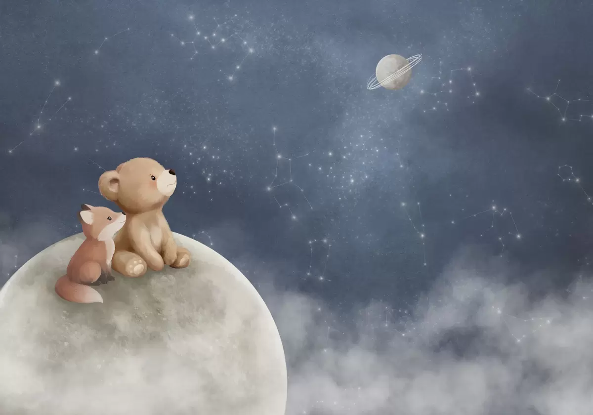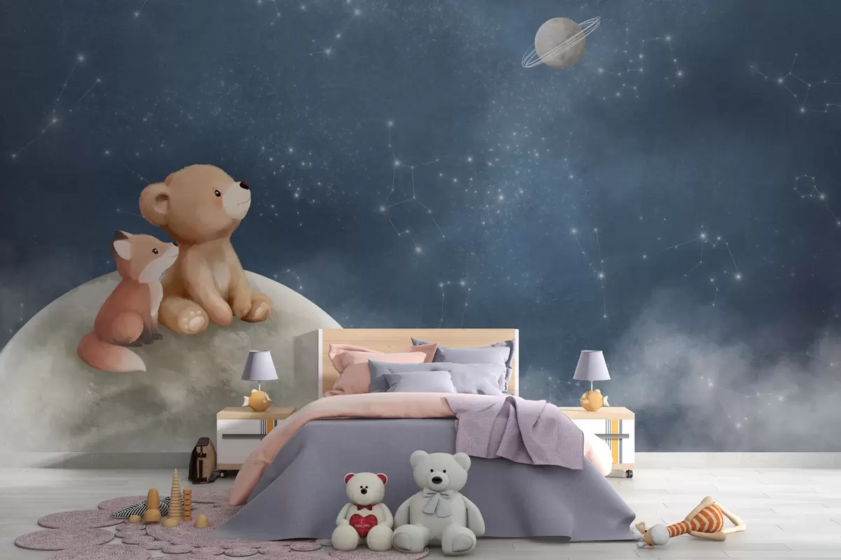 Тапете за зид Пастелна илустрација медведа и лисице ноћно небо бр. w05431