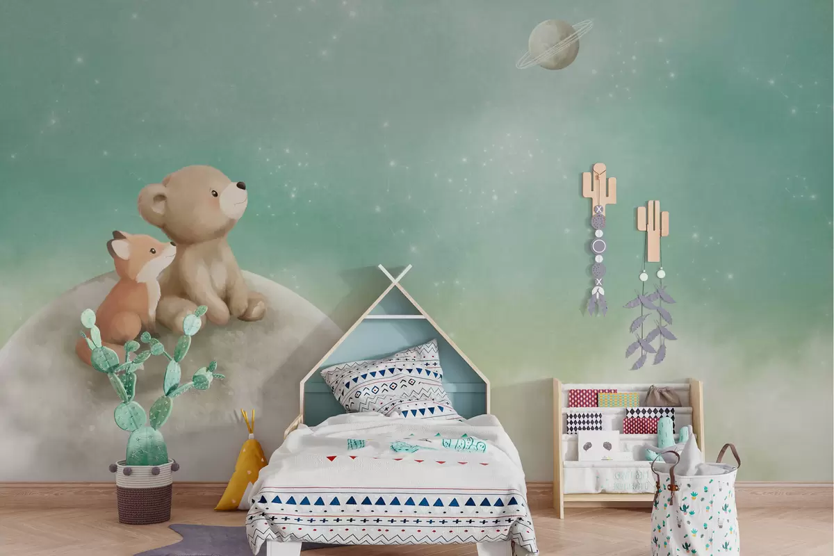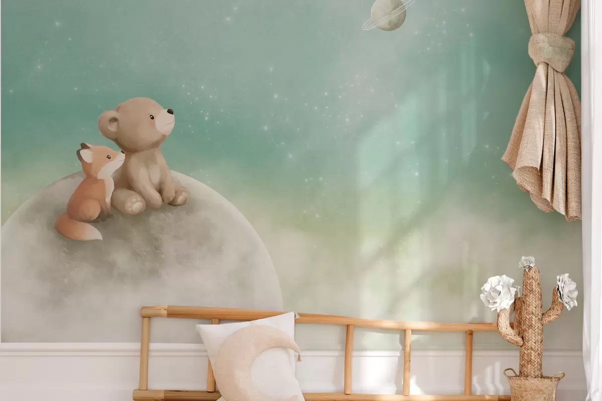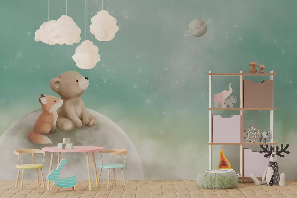 Тапете за зид Пастелна илустрација медведа и лисице зелено небо бр. w05431v1
