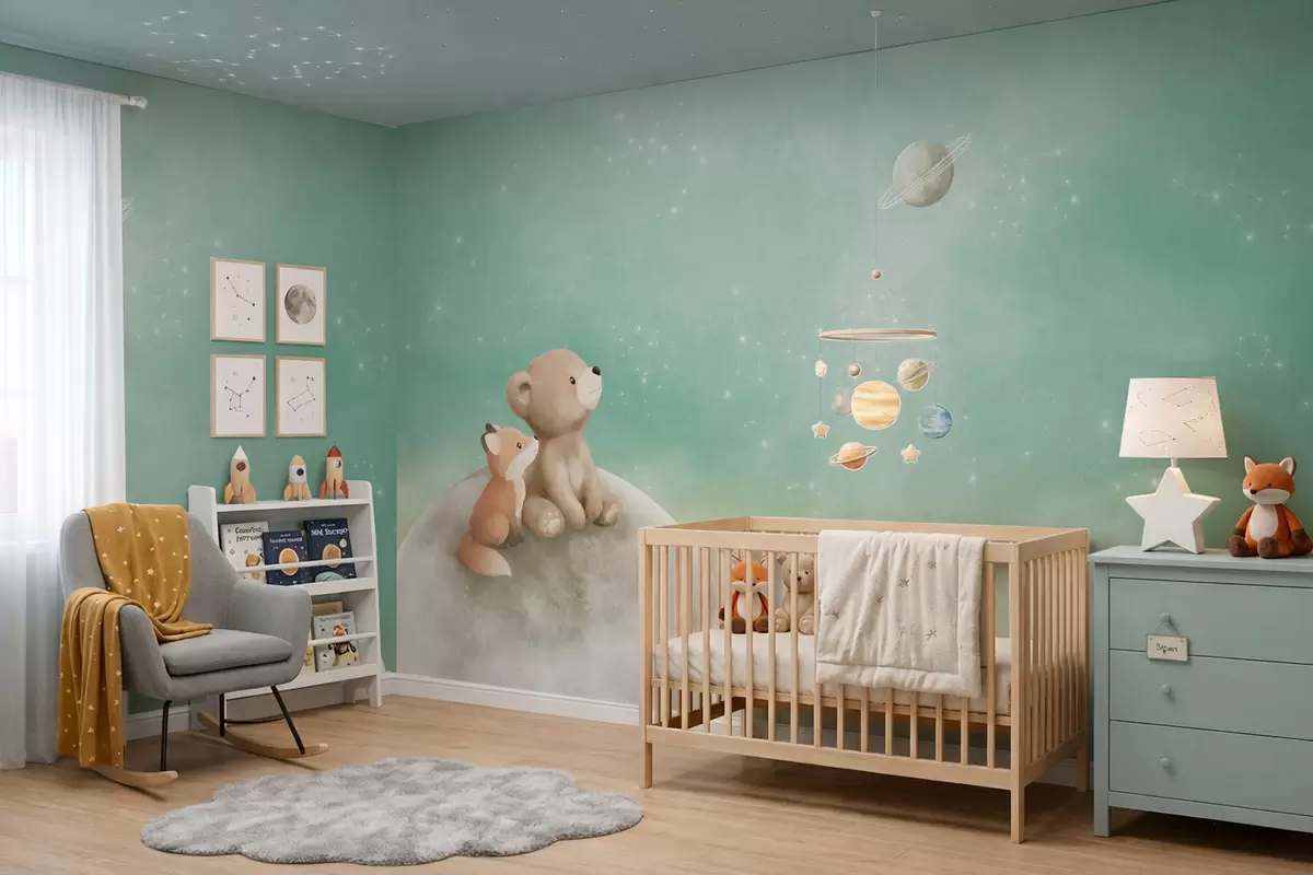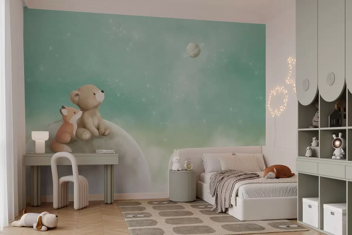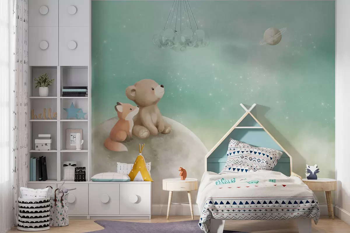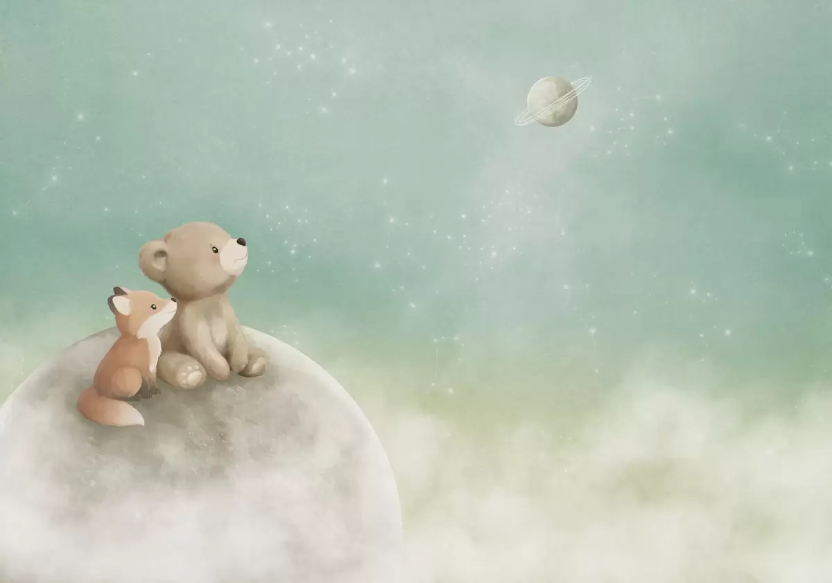 Тапете за зид Пастелна илустрација медведа и лисице зелено небо бр. w05431v1
