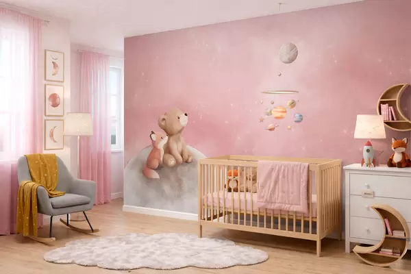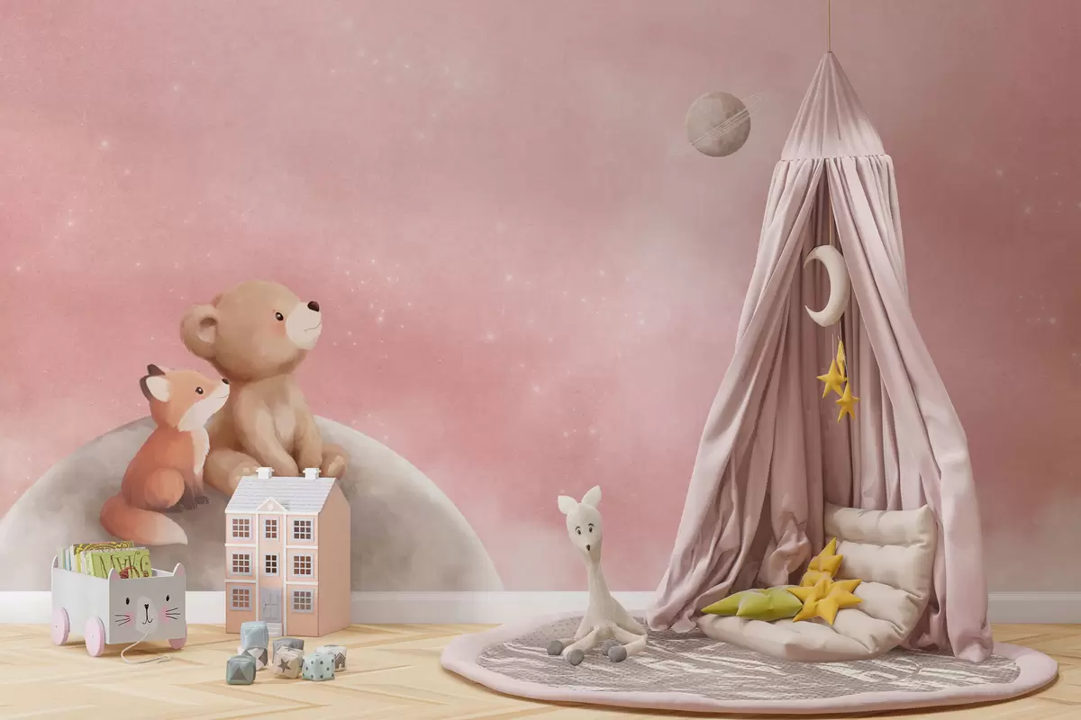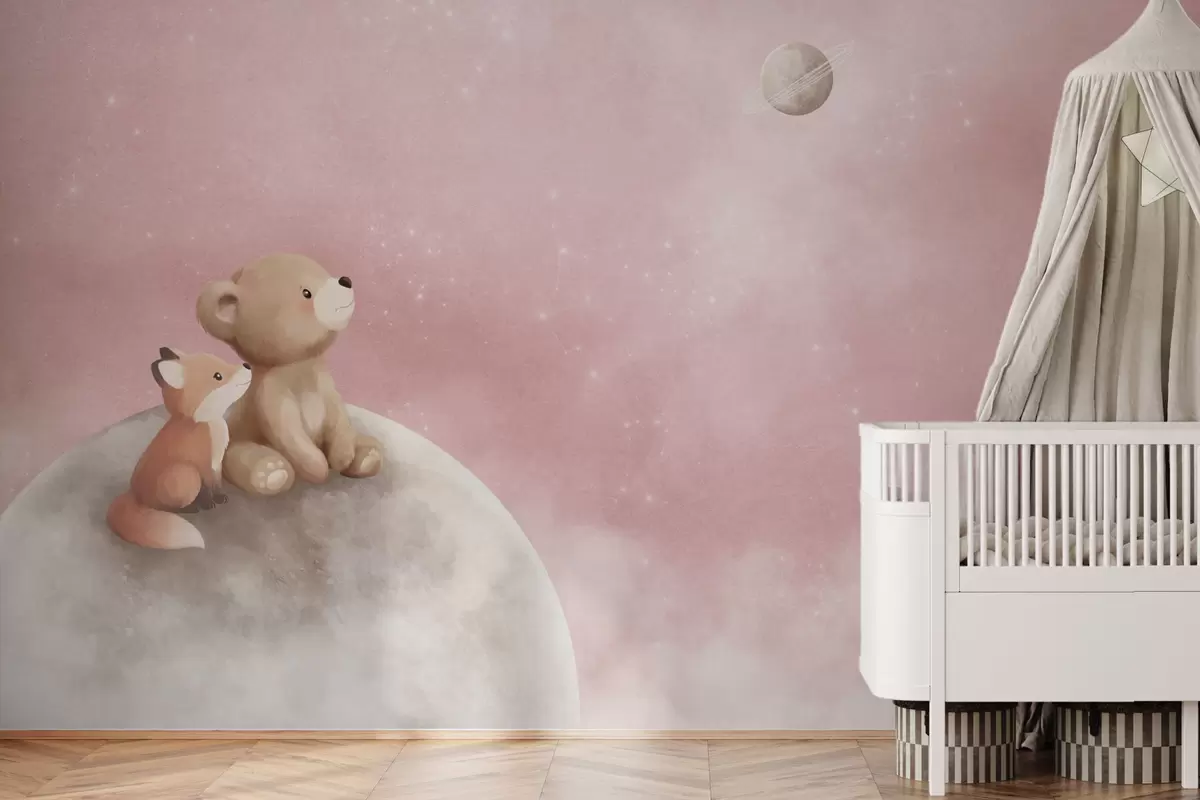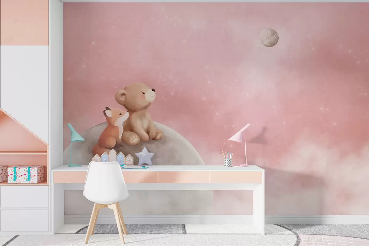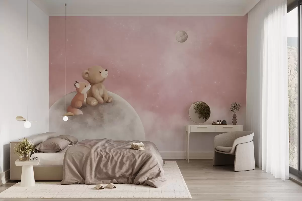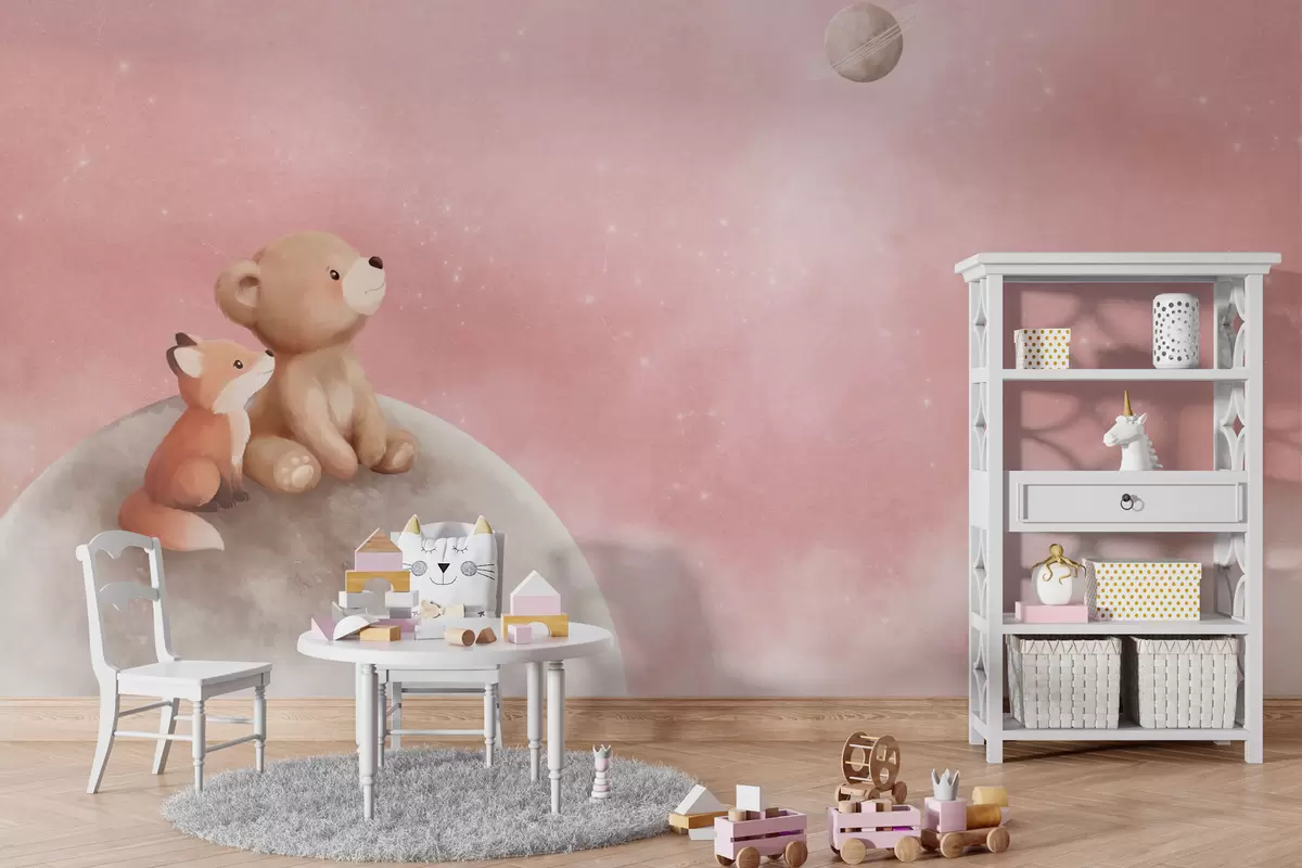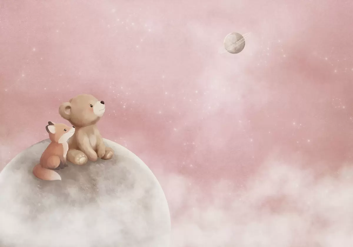 Тапете за зид Пастелна илустрација медведа и лисице на ружичастом небу са месецом бр. w05431v2