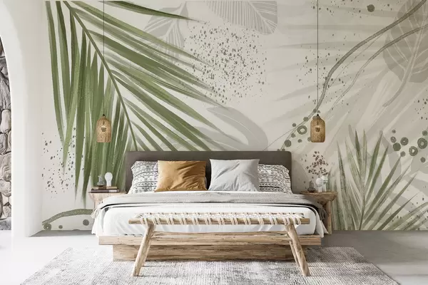 Тапете за зид Тропско зелено палмино лишће и лишће, са апстрактним облицима и прскањем у нијансама зелене и беле бр. w07918