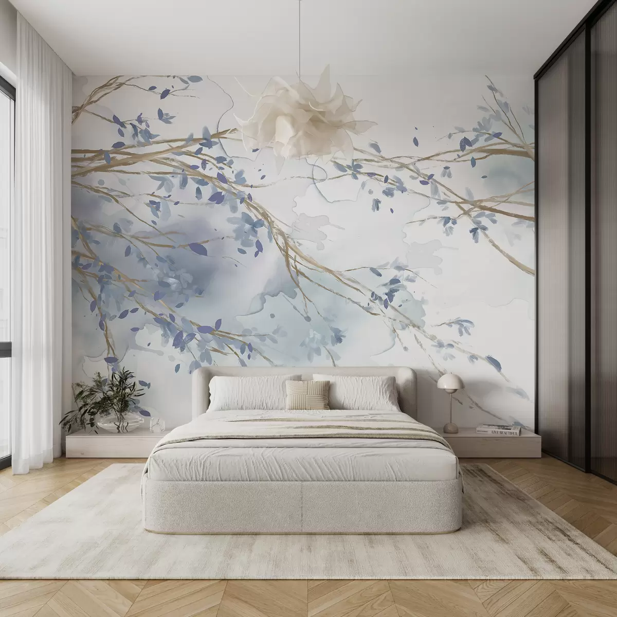 Тапете за зид Деликатне плаве и беле цветне гране са меком, замућеном позадином акварела бр. w07919
