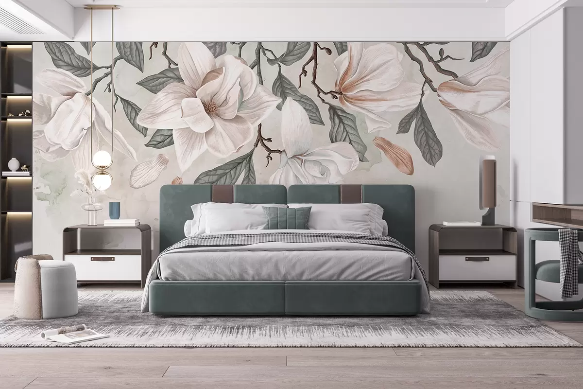 Тапете за зид Нежно розе и бело цвеће магнолије са зеленим листовима на светлој позадини, мека, цветна композиција бр. w07977