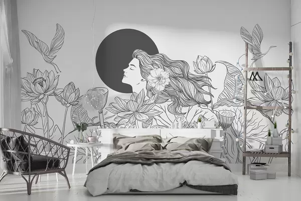 Тапете за зид Жена у природи, цртање линија, цветови лотоса, велико лишће, летеће птице, сива боја бр. w07988v2