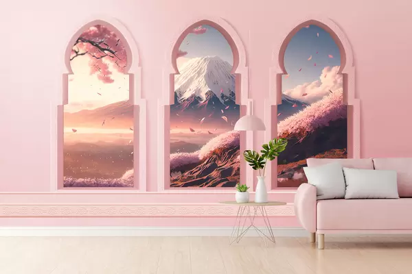 Тапете за зид Велики прозори у оријенталном стилу са невероватним погледом на планину Фуџи у нежној боји брескве бр. w08082