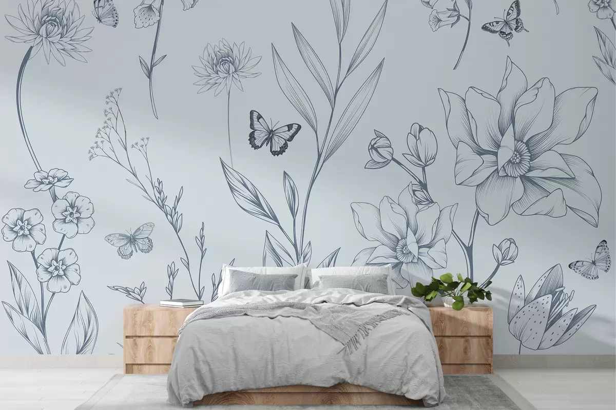 Тапете за зид Бохо монохромно цвеће и лептири у плавој боји бр. w08088v2