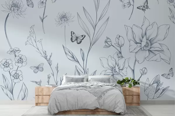 Тапете за зид Бохо монохромно цвеће и лептири у плавој боји бр. w08088v2