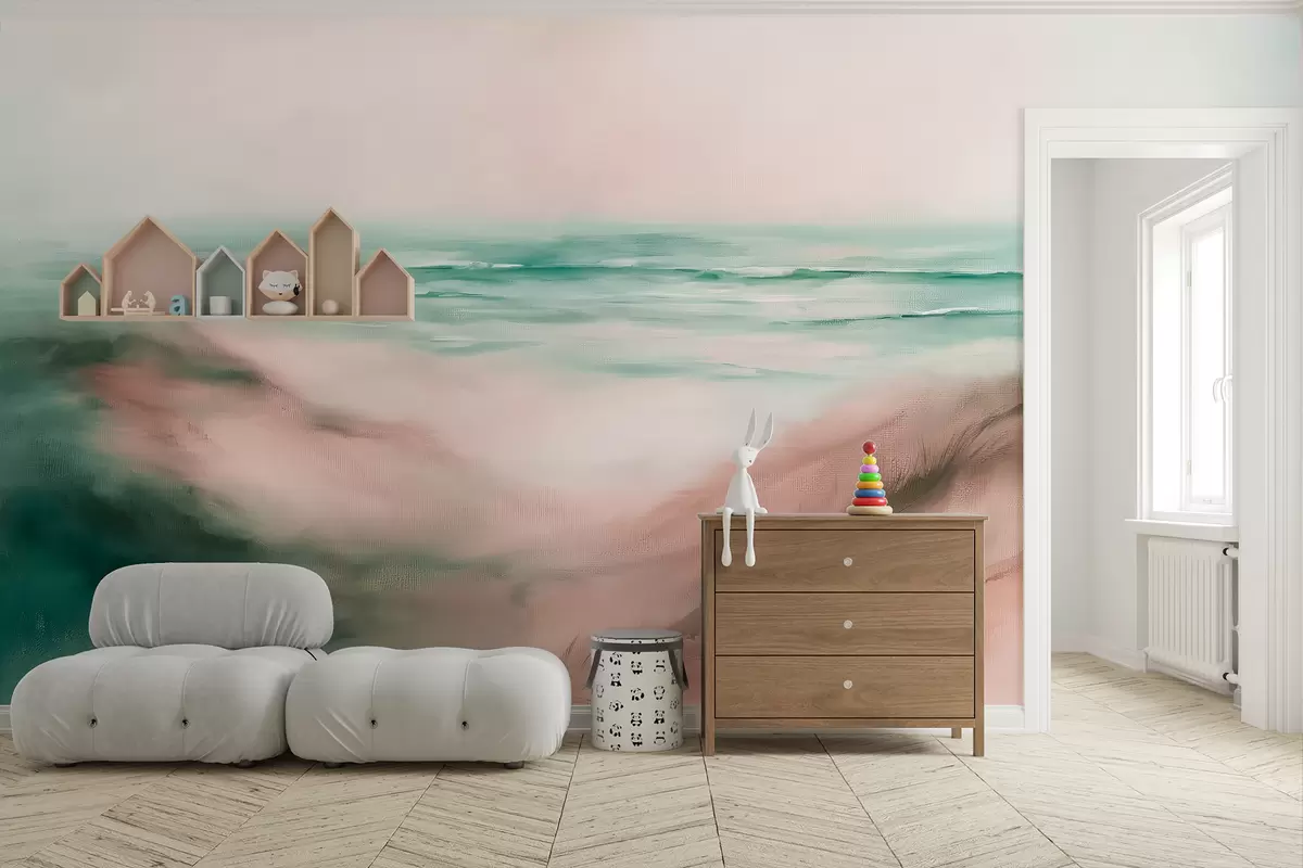 Тапете за зид Апстрактни пејзаж у пастелним бојама, плажа, море, аквамарин и ружичаста палета боја, потези четкицом бр. w08141v2