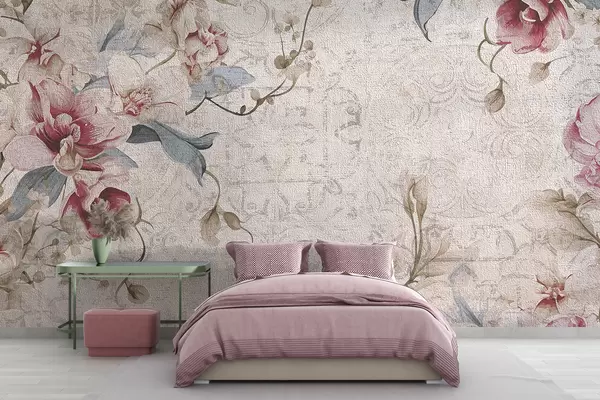 Тапете за зид Винтаге цветни узорак са деликатним ружичастим и белим цветовима, листовима на светло беж позадини бр. w08149