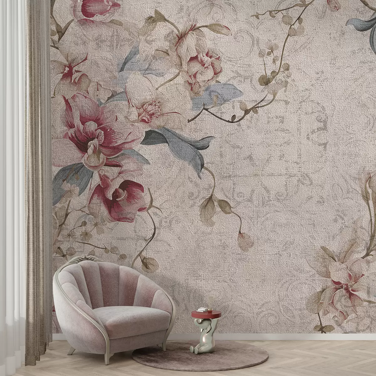 Тапете за зид Винтаге цветни узорак са деликатним ружичастим и белим цветовима, листовима на светло беж позадини бр. w08149