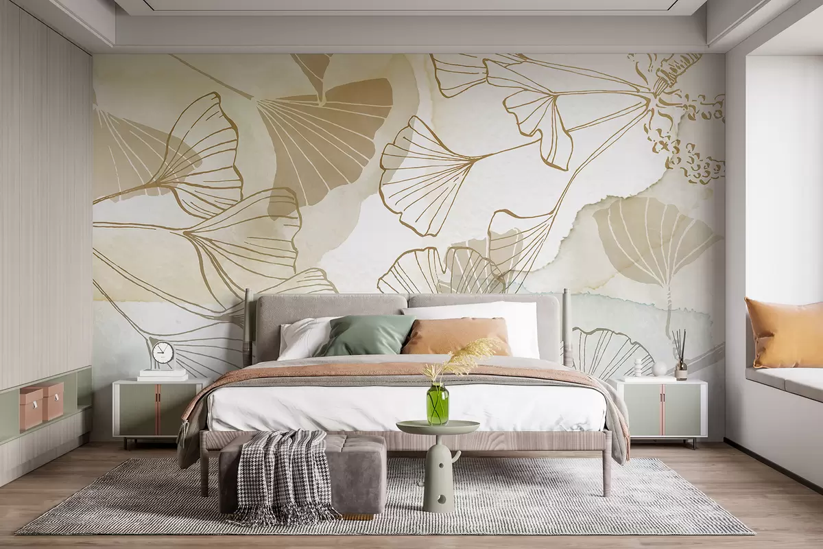 Тапете за зид Узорак деликатног лишћа гинка у нијансама беж, жутосмеђе и плаве на светлој позадини бр. w08157