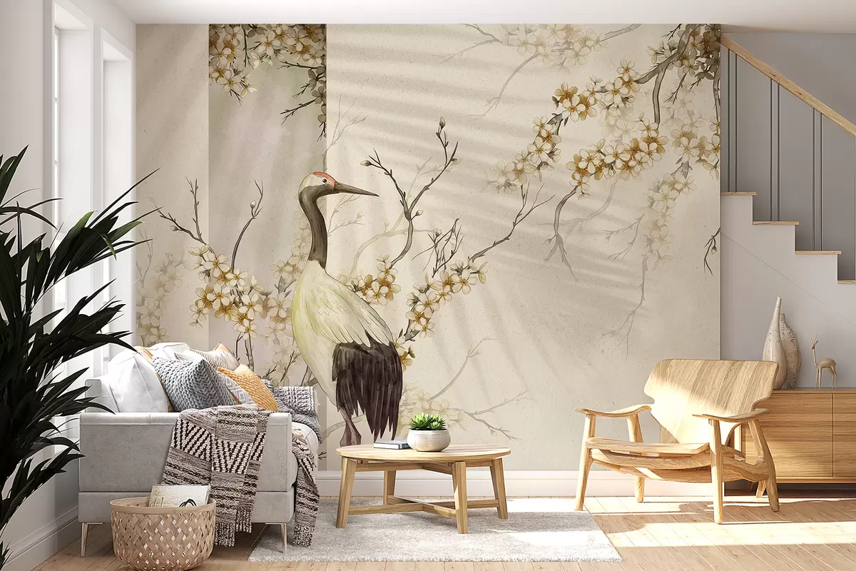 Тапете за зид Бели ждрал стоји на грани са расцветаним цвећем, на мекој, замућеној позадини бр. w08159