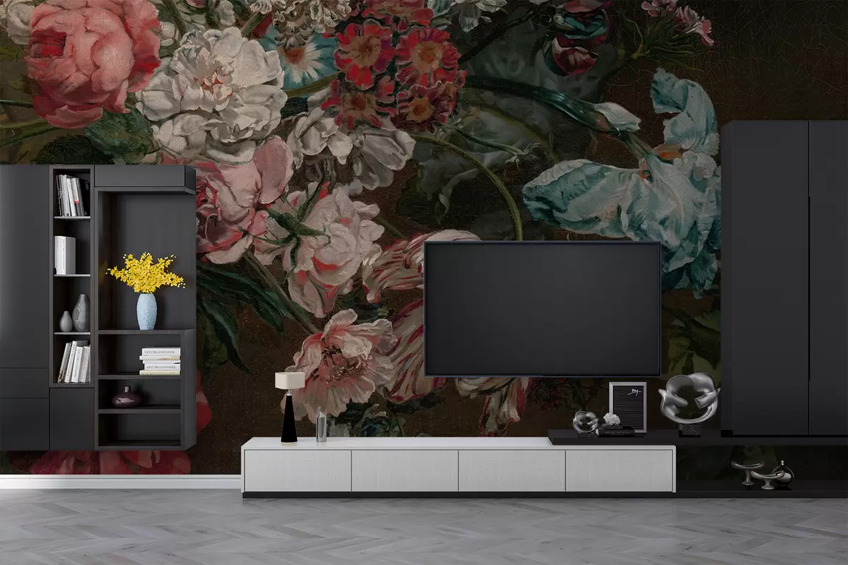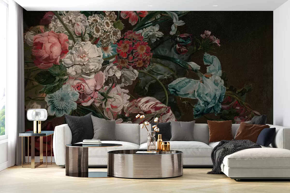 Тапете за зид Винтаге шарено цвеће укључујући ружичасте божуре, црвене каранфиле и беле љиљане на тамној позадини бр. w08163