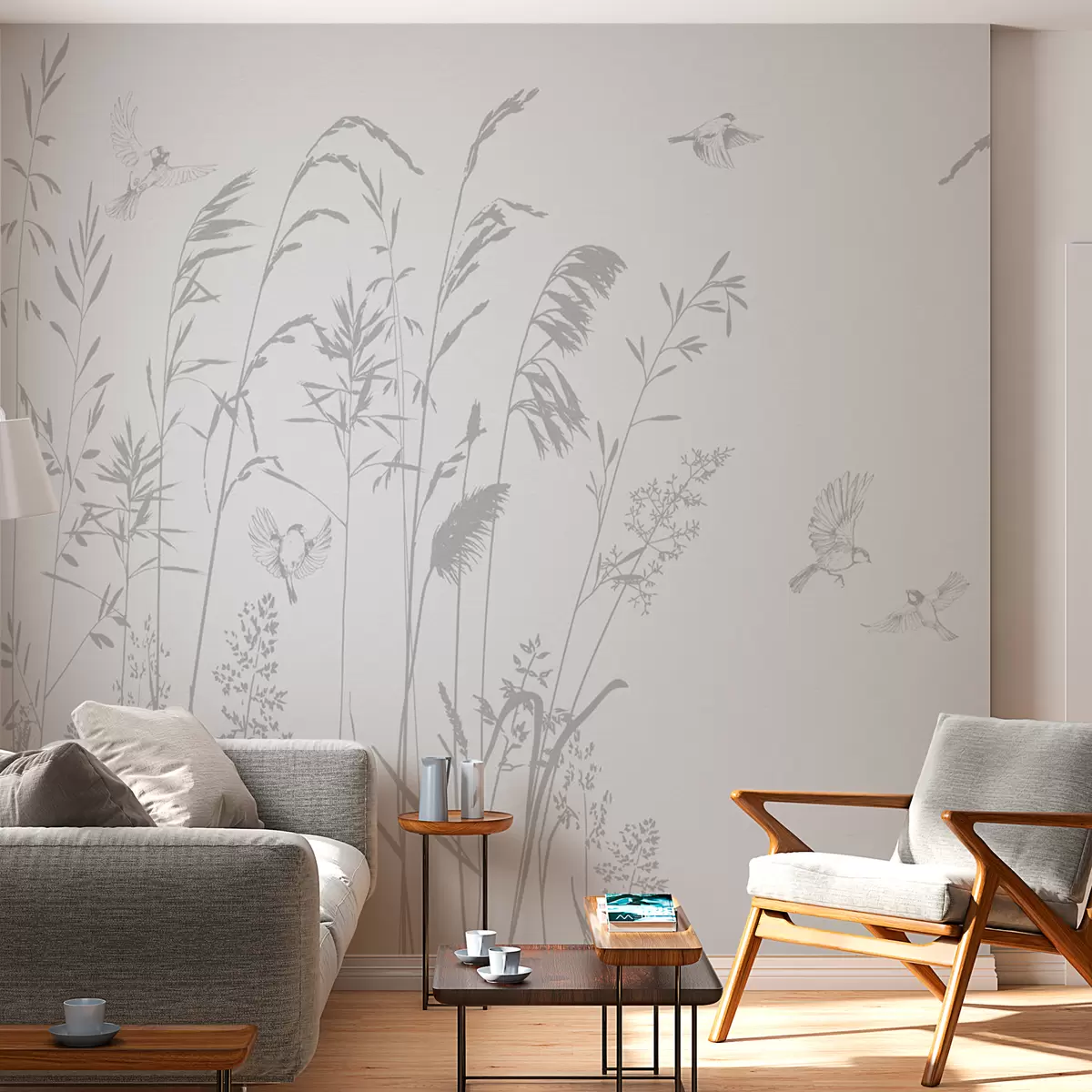 Тапете за зид Биљке и мале птице природа минимализам сиве боје бр. w08172v1