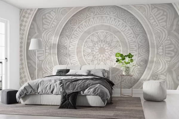 Тапете за зид Детаљан симетричан сиво-бели отисак мандала са концентричним круговима и геометријским облицима бр. w08182