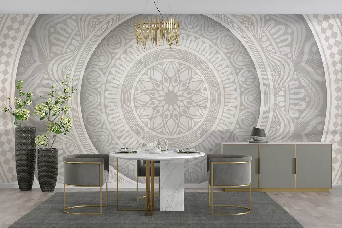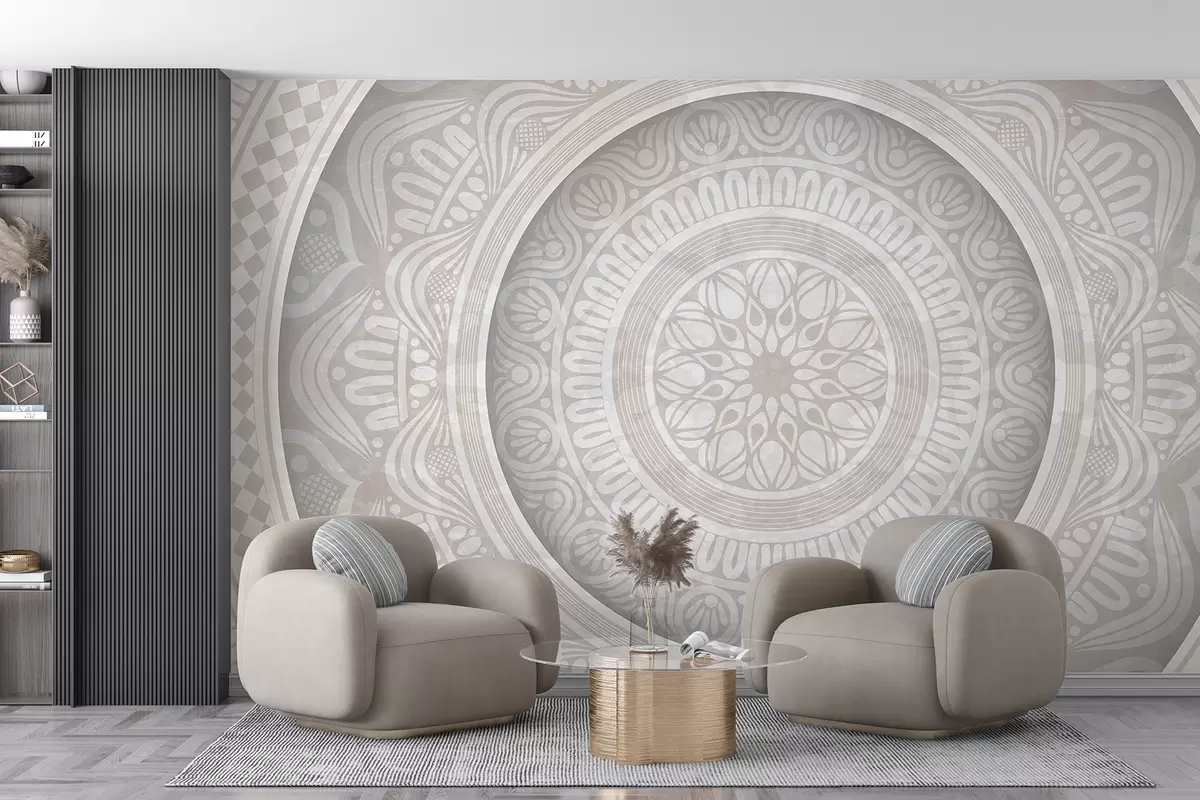 Тапете за зид Детаљан симетричан сиво-бели отисак мандала са концентричним круговима и геометријским облицима бр. w08182
