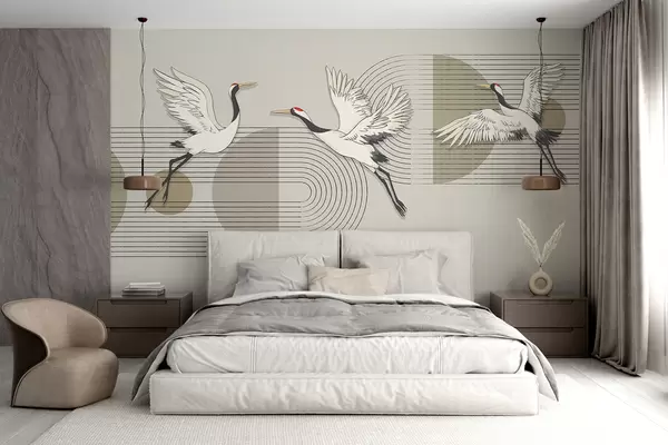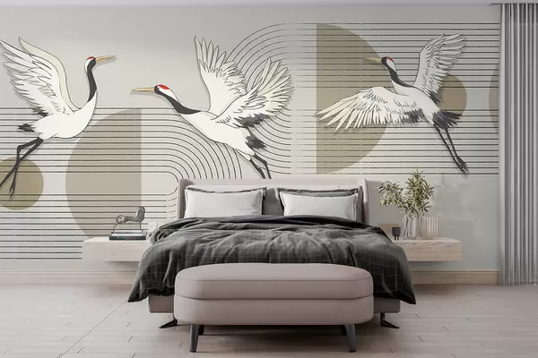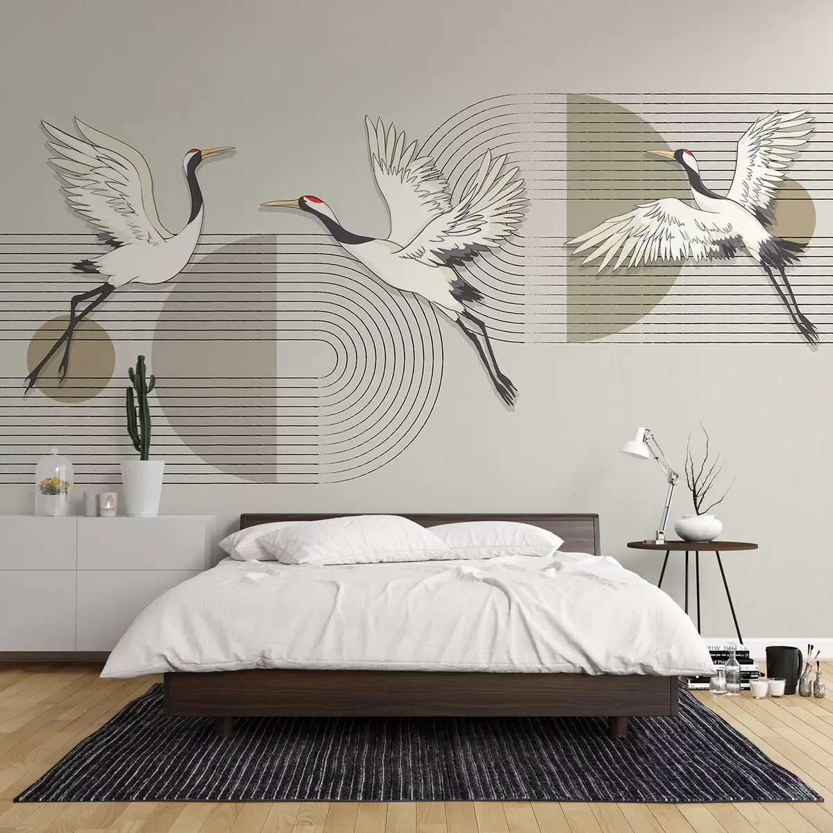 Тапете за зид Три бела ждрала у лету на геометријској минималистичкој позадини са концентричним круговима бр. w08188