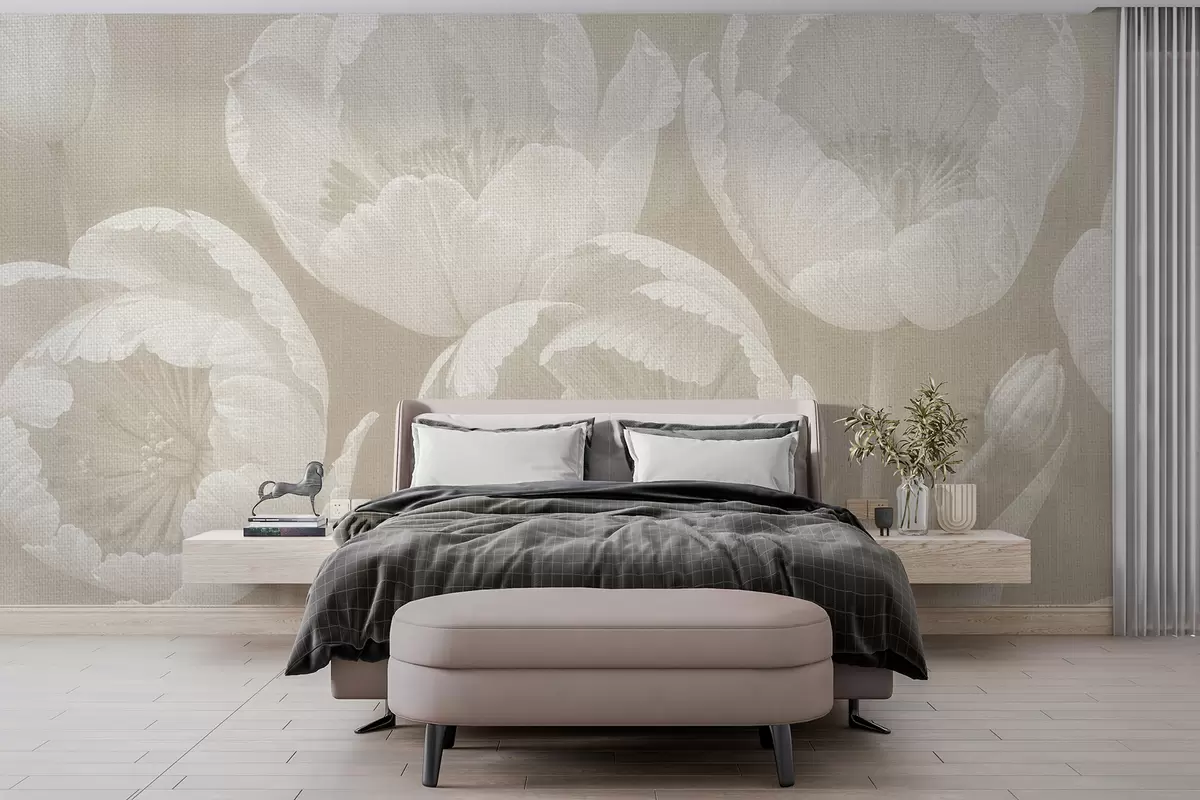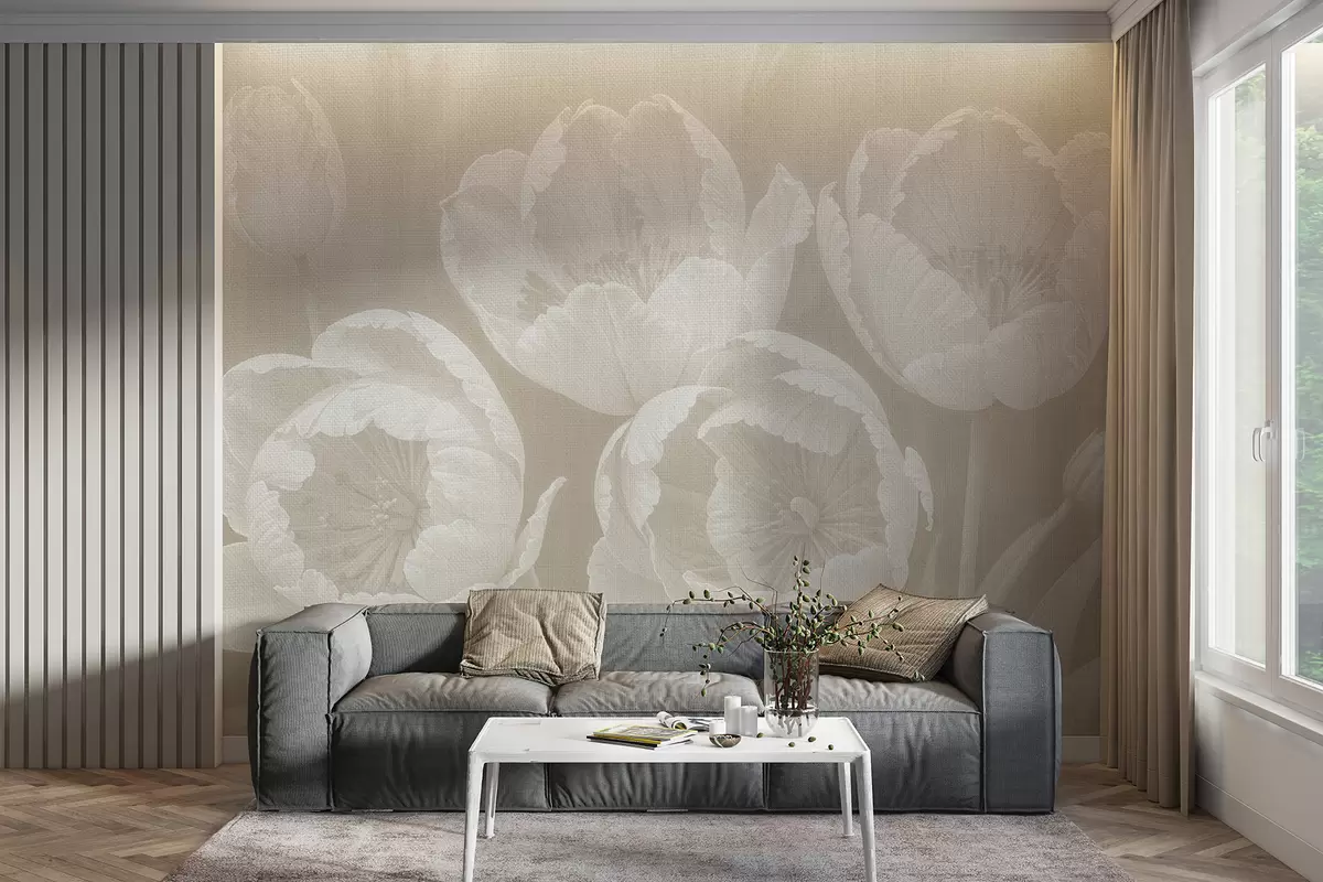 Тапете за зид Цртеж белих лала са меком, платненом текстурираном ружичастом замагљеном позадином, минималистички монохроматски принт бр. w08193v1