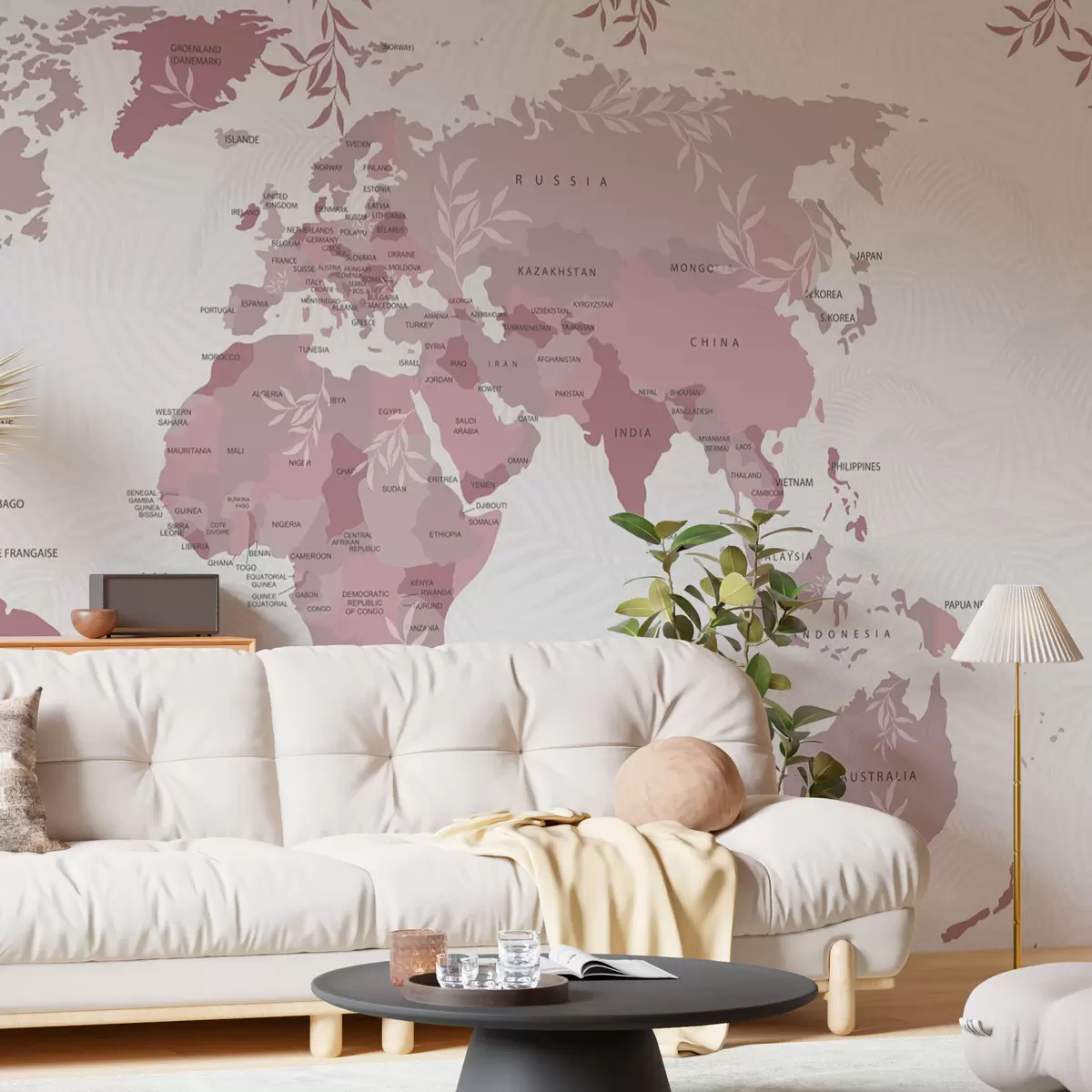 Тапете за зид Елегантна мапа света са листовима и биљкама ружичасте боје бр. w08211v3