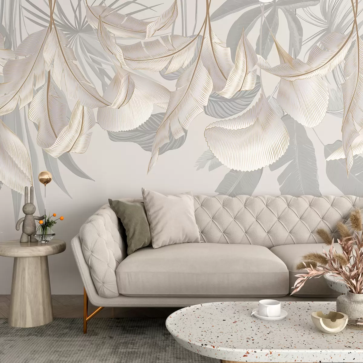 wall murals Деликатни бели и сиви цветни тропски листови стварају меку, етеричну позадину w08217