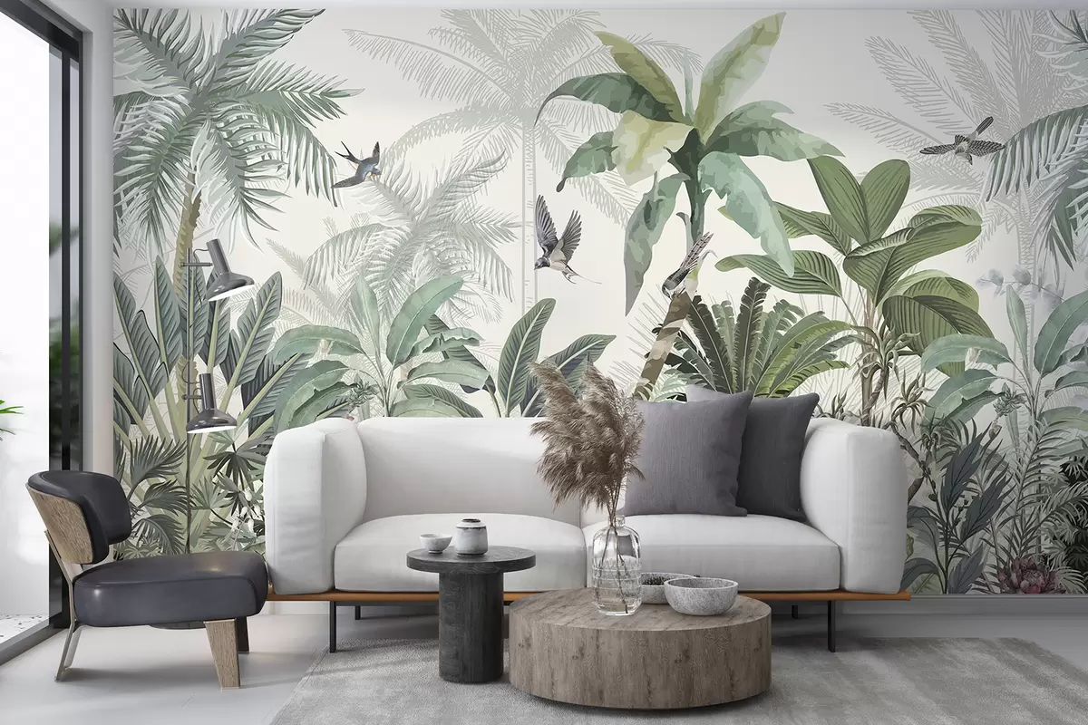 Тапете за зид Бујна сцена тропске џунгле са разним палмама, великим лишћем и шареним цвећем у првом плану бр. w08239