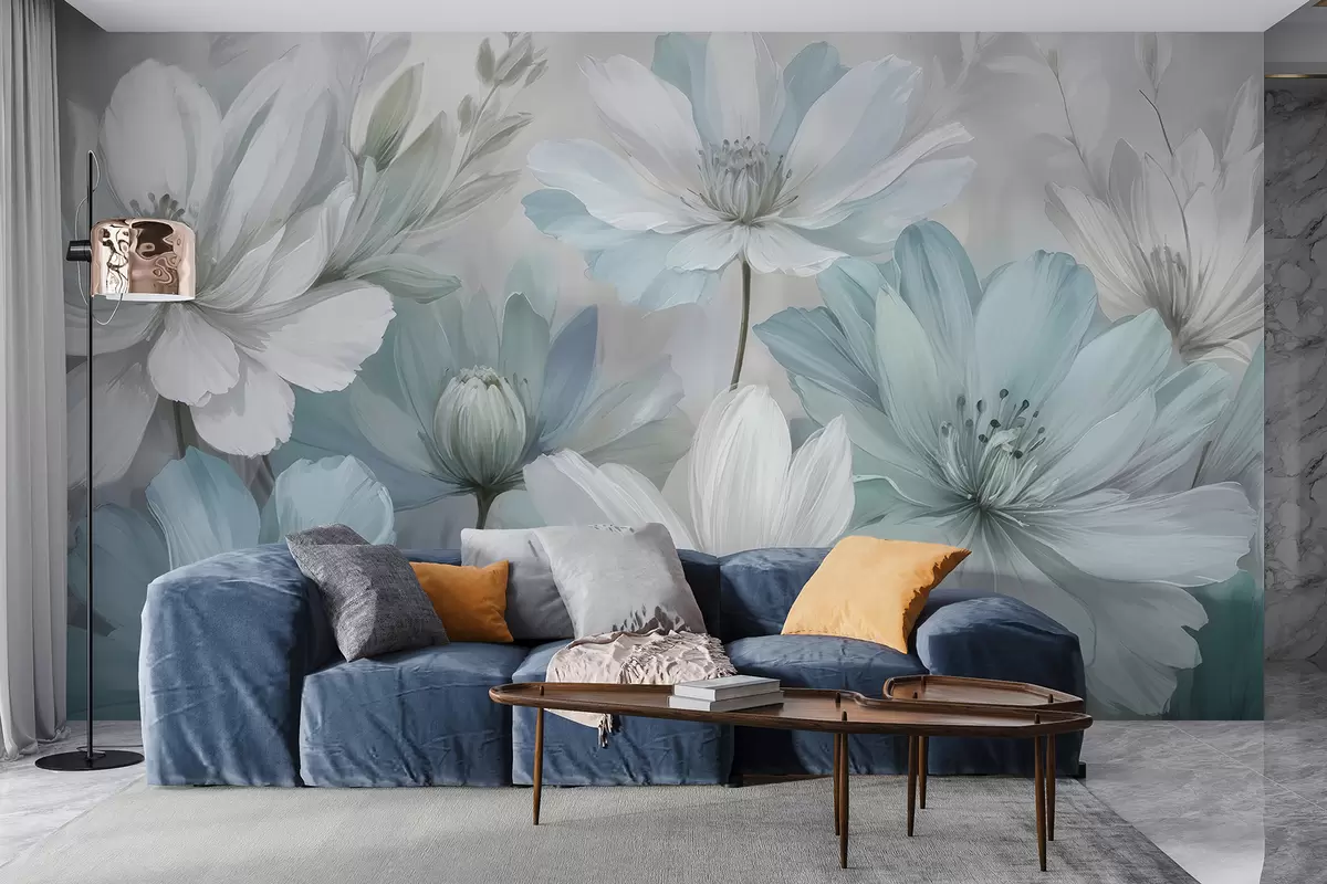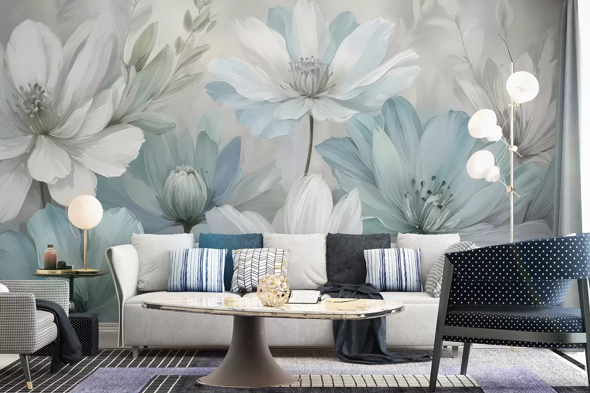 Тапете за зид Крупни план белог и светлоплавог цвећа налик на тратинчице слика уметност са меком, замућеном позадином бр. w08247