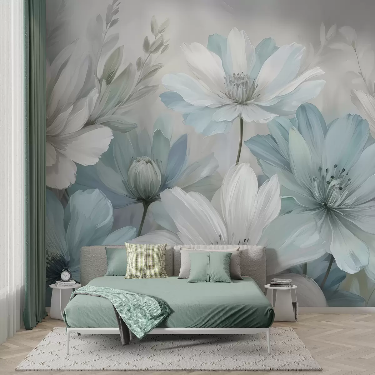 Тапете за зид Крупни план белог и светлоплавог цвећа налик на тратинчице слика уметност са меком, замућеном позадином бр. w08247