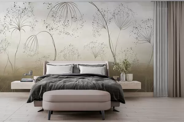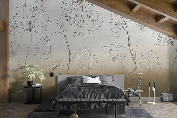 Тапете за зид Смеђе високе, танке биљке са деликатним цветовима у облику кишобрана или главама семена у магловитом, атмосферском окружењу бр. w08258
