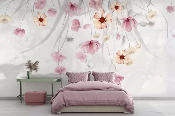 Тапете за зид Деликатно пастелно ружичасто и жуто цвеће са жутим средиштима каскадно пада на меку, замућену позадину бр. w08261v1