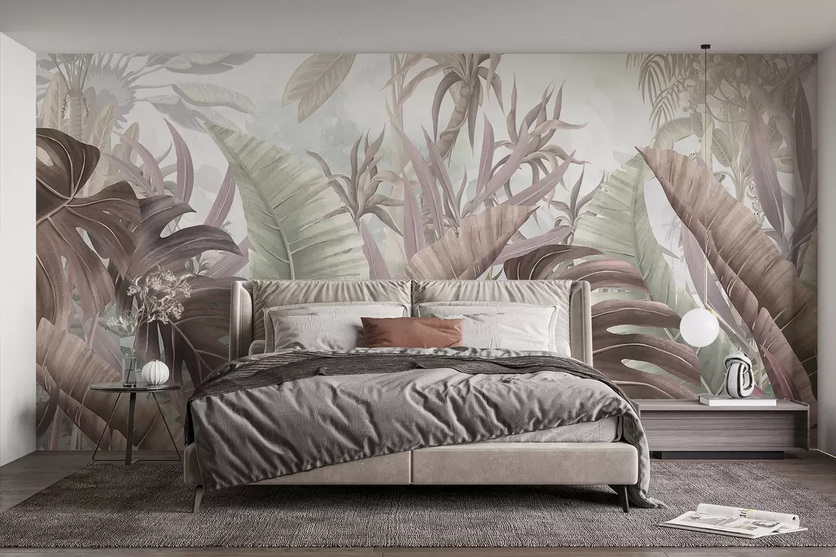 Тапете за зид Тропска џунгла са великим палминим листовима и егзотичним биљкама у нијансама сиве, беле и беж бр. w08307