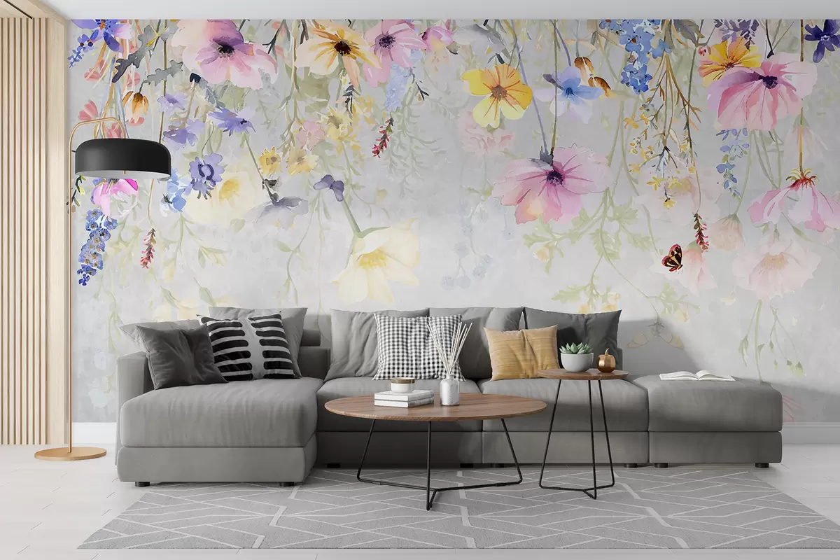 Тапете за зид Шарени цветови са ружичастим, жутим и плавим цветовима који виси са врха на текстурираној сивој позадини бр. w08309