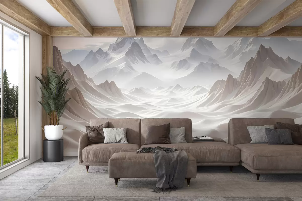 Тапете за зид Снежни планински врхови израњају из магловитог, етеричног пејзажа са валовитим брдима и долинама бр. w08313
