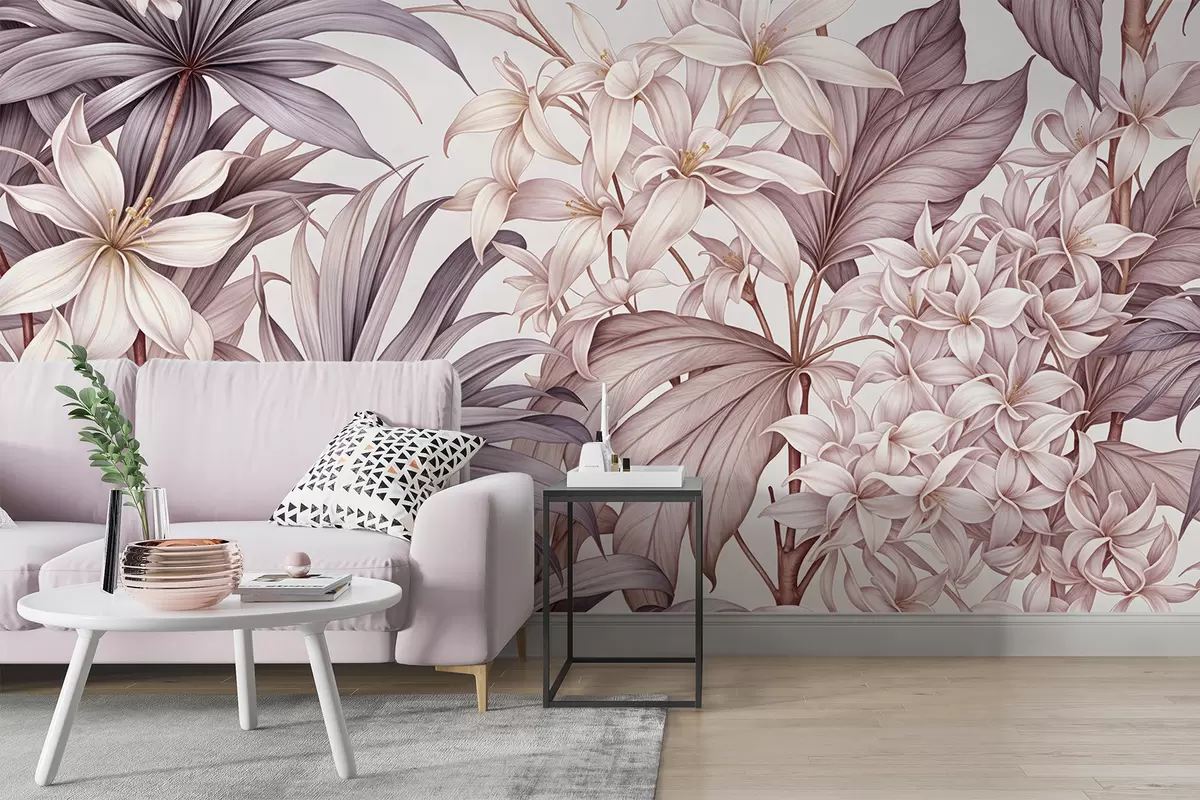 wall murals Тропски цветни принт са великим белим и светло розе цветовима, бордо листовима и неутралном позадином w08318v1