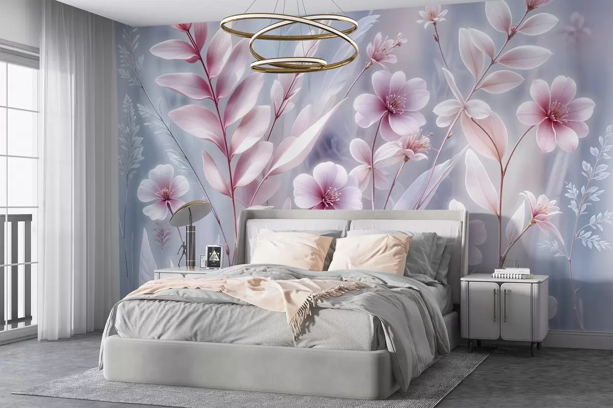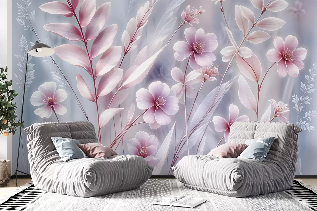 Тапете за зид Нежно розе цвеће и цветови са меким латицама и листовима на бледо сивој апстрактној позадини бр. w08323