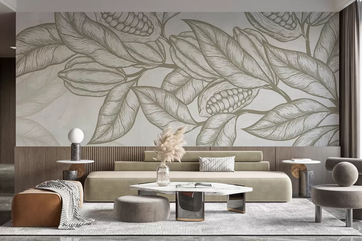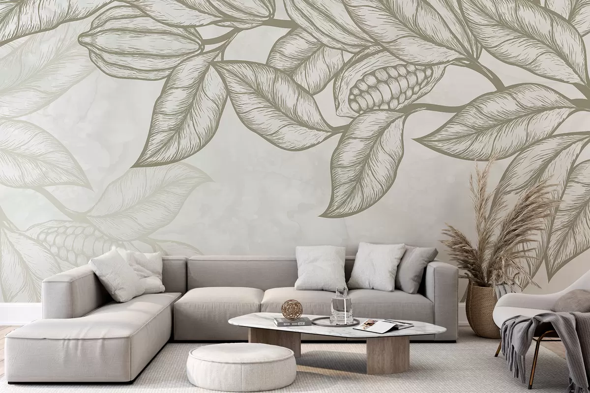 Тапете за зид Детаљан цртеж какао листова и лишћа у природном, органском отиску бр. w08334