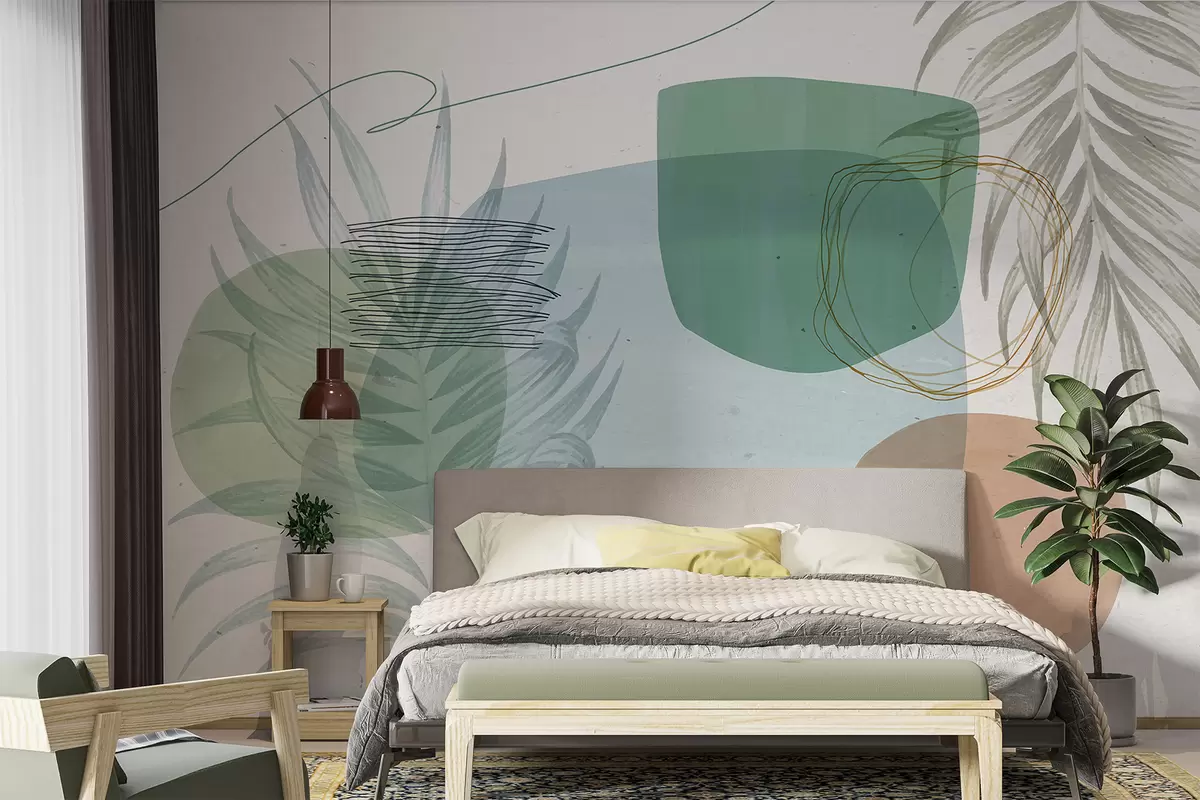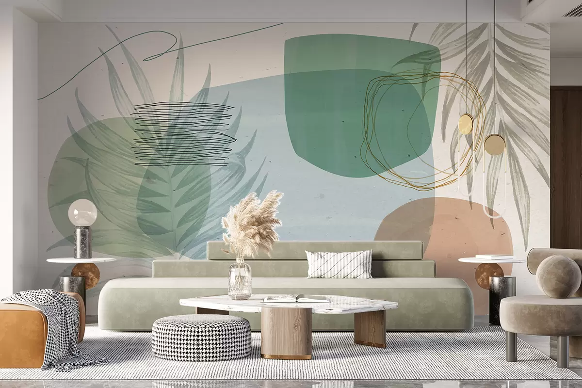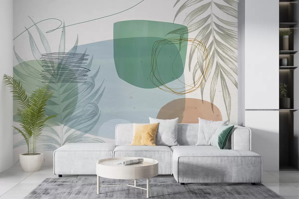 Тапете за зид Композиција апстрактне текстуре са органским облицима и тропским листовима, у пригушеним пастелним бојама бр. w08335